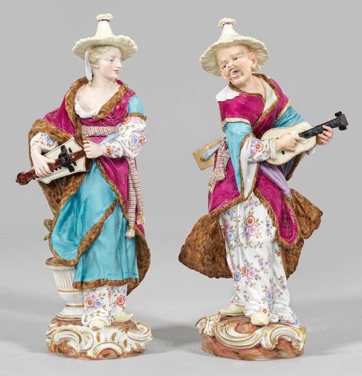 Контрастные пары. Стоя на рельефной основе в стиле рокай, вихрующий играющий вертел Малабар или гитарист Малабар, одетый в длинное платье с узором из индийских цветов и оплетенный мехом, надетый пурпурный плащ и коническую соломенную шляпу, несущий в руках фонарь или деревянный ящик на спине. Полихромная живопись с золотыми деталями. Возможно, выполнены Фридрихом Элиасом Майером. Модельные номера 1519 и 1523. Незначительные сколы/восстановления; маркировка в виде перекрещенных мечей. Высота: 32 см. См. каталог Государственной фарфоровой мануфактуры Мейссен, II, 1519, 1523. Пара подвесных фарфоровых фигур Малабар. Мейссен, вторая половина XIX века.