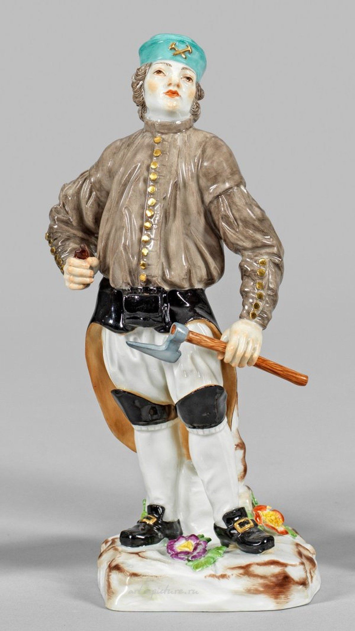 На цветущем цветочном каменном основании стоит стоящий шахтер в типичной рабочей одежде, с морской зеленой кепкой на голове, держащий молоток в правой руке и кирку в левой. Окрашено полихромией с применением золота. Принадлежит или Иоганну Йоахиму Каендлеру, или Петеру Райнике. Модельный номер 1309. Марка "меч". Высота 20,5 см. Фарфоровая фигурка шахтера-руководителя. Марка перекрещенных мечей. Майсен. Середина 20 века.