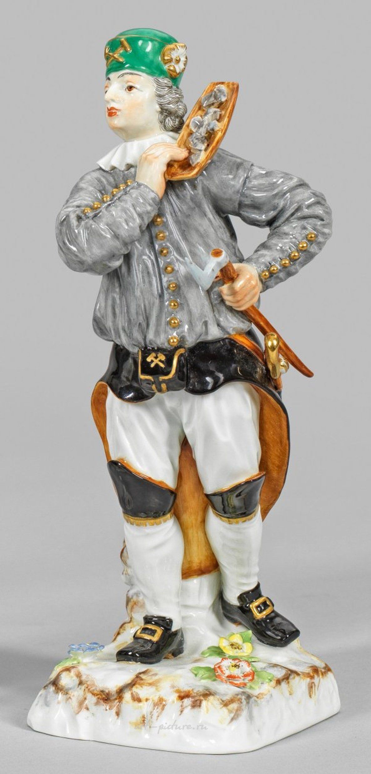 На цветущем каменном пьедестале стоит стоящий шахтер в типичной рабочей одежде, в левой руке держит кирку, а на правом плече носит корзину. Многоцветная живопись с золотом. Возможно, работа Иоганна Иоахима Кандлера и Петера Райнике. Номер модели 69510. Небольшое восстановление. Отметка меча. Высота 21 см. Фарфоровый шахтер с подносом. Незначительно восстановлен. Отметка скрещенных мечей. Мейсен. После 1973 года.