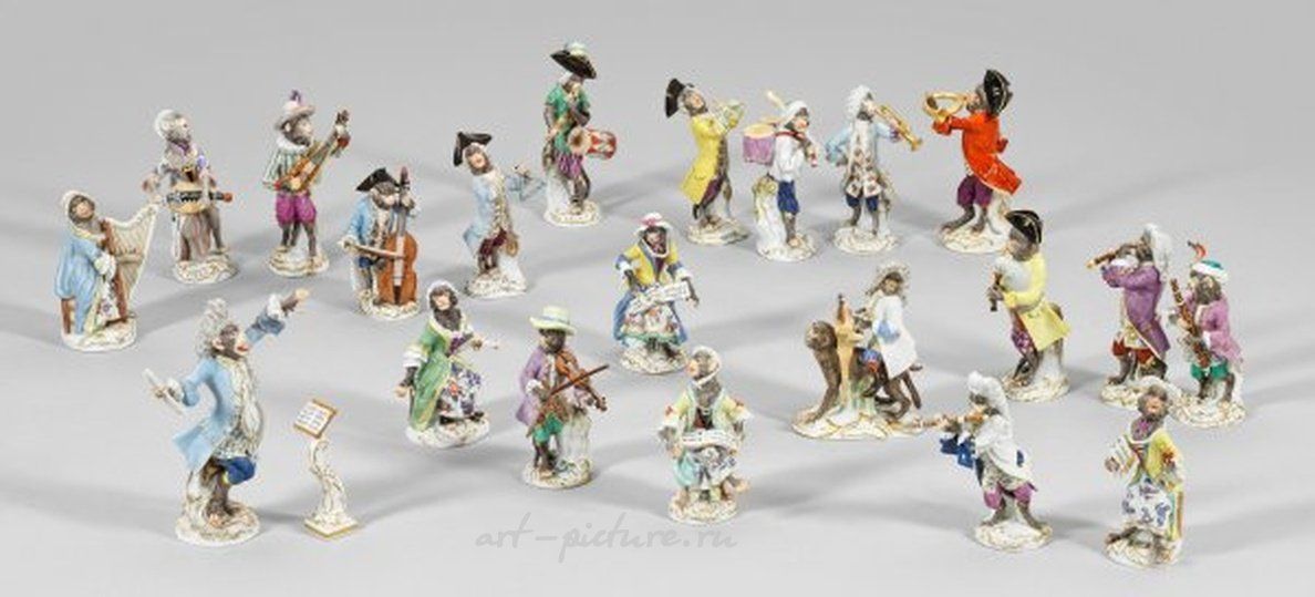 2 2 - т л г . ; На рельефной базе Рокайе двадцать одна стоящая и сидящая фигура хапельмейстера, скрипачей, контрабасистов, кларнетистов, арфистки, барабанщика и его помощника, трубачей, игроков на валторне, треугольнике, волынке, фаготистов, флейтистов, гитаристов, барабанщиков, гуделкиста, пианиста и четырех певиц, а также музыкальная партитура. Полихромная живопись с золотыми деталями. Каким-то образом связано с Иоганном Иоахимом Кендлером и Петером Райнике. Частично восстановлено, присутствуют следы мечей. Высота от 9 см до 17 см. Разные обезьяны из оркестра упоминаются в рабочих отчетах Иоганна Иоахима Кендлера в период с 1749 по 1766 год. Уже в 1753 году Кендлер создал ансамбль обезьян-музыкантов в красочной одежде с affectation, который он переделал в сотрудничестве с Петером Райнике около 1765/1766 годов. Изображения животных с человеческими характеристиками и поведением были особенно популярными из-за большого интереса к иллюстрациям басни в 18 веке, особенно в так называемой "singerie" французских художников, которые показывали любопытные сцены обезьян, выступающих в роли людей в различных ситуациях. См. Рюккер, Cat. Байер. Национальный музей, стр. 192, Соннтаг, Обезьяньи оркестры из фарфора Мейсена, стр. 29 и далее. Полная коллекция из 22 фарфоровых фигур "обезьяньего оркестра", созданных Й. Й. Кендлером и П. Райнике. Частично восстановлено. Мечи показаны на перекрестии. Мейсен. Вторая половина 20 века.