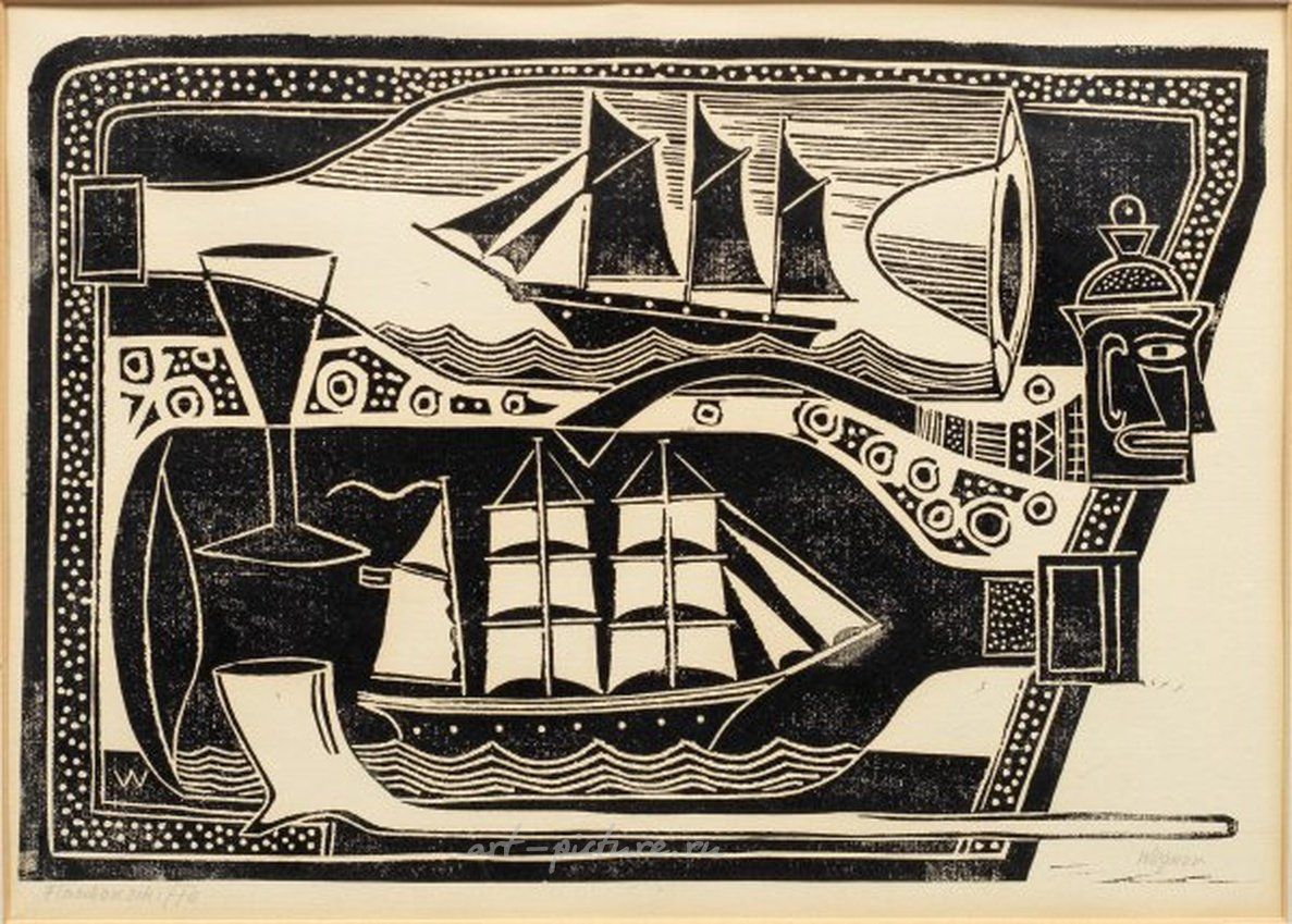 Эрих Вегнер (1899 Гнойен - 1980 Ганновер) "Бутылочные корабли". Оригинальное название. Линоцут на бумаге. Подписано и имеет монограмму на пластине; подписано и имеет название в левом углу. Изображение примерно 25,7 см х 37,2 см. В рамке. Происхождение: северно-немецкая старая семья гостиницевладельцев. Линоцут на бумаге. Ручная подпись и название.