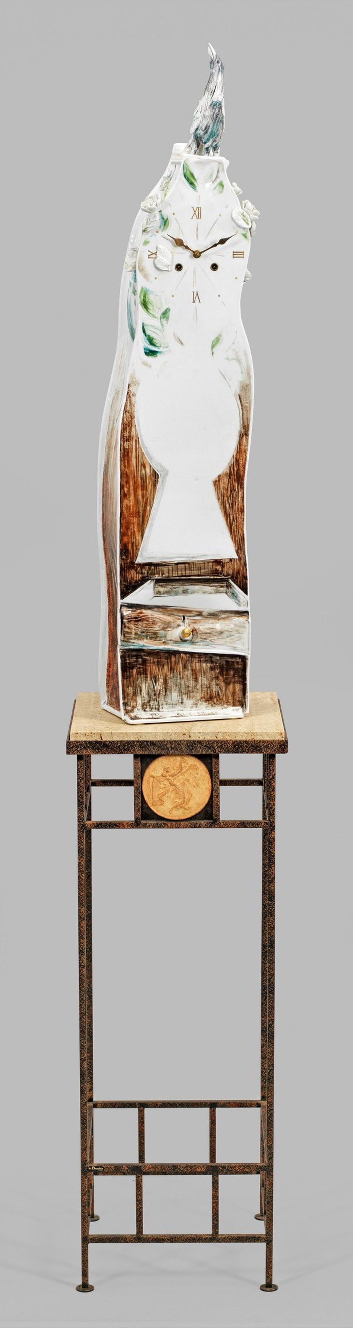 Вытянутое тело белого фарфора, изогнутое как балясина, увенчанное полностью вылепленной птицей. Узкие стороны с пластиковыми вкладками цветов и листьев. На дисплее указан римский циферблат с золотыми цифрами и прикрепленными позолоченными металлическими стрелками. Внизу указан ящик. Разреженная, полихромная, прозрачная глазурованная живопись с золотом. Форма и декор Петра Странга. Подпись художника с датой "П. Странг (19)96". Отливная монограмма художника П.С. (марка мастерской). Уникальный номер 488/1996. Механизм с заводной ключом и боевым механизмом на колоколах. В комплекте металлический пьедестал с врезными квадратными каменными плитами и старинным керамическим рельефным медальоном. Марка меча. Высота 94.5 см. 19 см x 14 см. Этот часы, созданные в художественных мастерских Мейсенской государственной фарфоровой мануфактуры, являются уникальным объектом как по форме, так и по живописи. Включено: Свидетельство от Мейсенской фарфоровой мануфактуры, октябрь 2018 года.