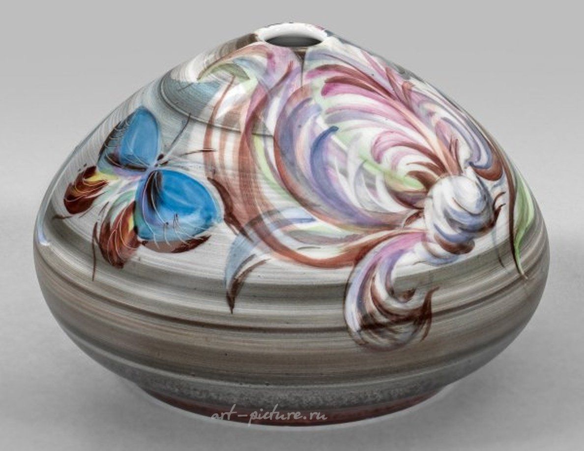 Тело Волькмара Бретшнайдера имеет круглую, выпуклую, конусовидно зауженную форму с узким ртом. Всеобъемлющие, концентрически двигающиеся декоративные полосы в оттенках серо-коричневого цвета с абстрактными большими цветами и бабочками, выполнены в блестящей полихромной слоистой росписи с динамичными мазками кисти. Форма и декор Волькмара Бретшнайдера. Художник, подписанный и с датой "В.Б. (19)91". Инкрустированный уникальный номер 92/91. Меченая марка. Высота 9 см. Диаметр корпуса 13 см. Выразительные цветочные интерпретации Бретшнайдера являются свободными, живыми композициями и выражением так называемой "Новой Цветочной Живописи" на Майсенской Мануфактуре. Сопровождается сертификатом от Государственной Фарфоровой Мануфактуры Майсен, №1784, ноябрь 1992 года. Фарфоровая ваза с декором "Художественная Вариация Цветов VI", разработанная и нарисованная В. Бретшнайдером. С датой. Уникальное произведение с номером 92/91. Меченая марка с перекрещенными мечами. Сопровождается сертификатом Майсенской фарфоровой мануфактуры. Майсен, 1991 год.