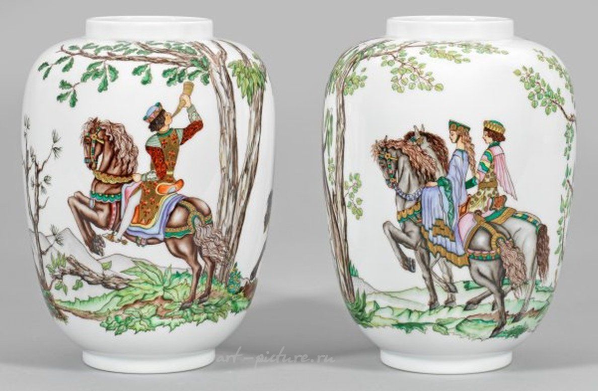 "Венский стиль "Охота на сокола" в ар-деко: пара фарфоровых ваз.",