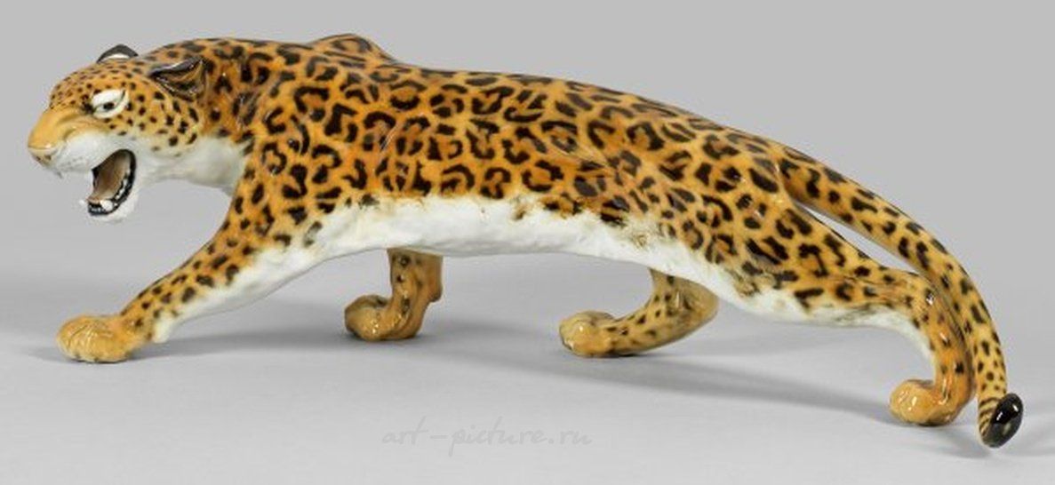 С естественной фурнитурой в подглазурной росписи. Возможно, выполнено Гюнтером Грангертом. Заводская марка. Дл. 46 см. Происхождение: Из имения значительной северогерманской частной коллекции. Фарфоровая фигурка леопарда. Заводская марка. Зельб, Хутшенройтер. Вторая половина 20 века.