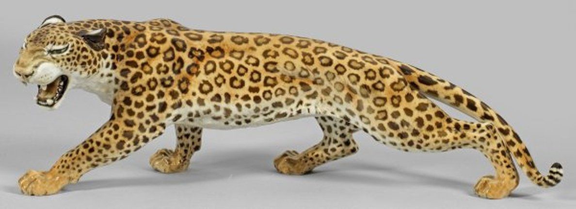 Полностью скульптурное, динамичное изображение шипящего, выслеживающего леопарда с естественным узором меха. Раскрашено подглазурной росписью в бежевых и различных оттенках коричневого цвета. Возможно, автором является Гюнтер Грангерт или подобный художник. Пометка производителя: длина 47 см. Фигурка леопарда из фарфора. Марка производителя: Зельб. Лоренц Хутшенрейтер. Середина 20-го века.