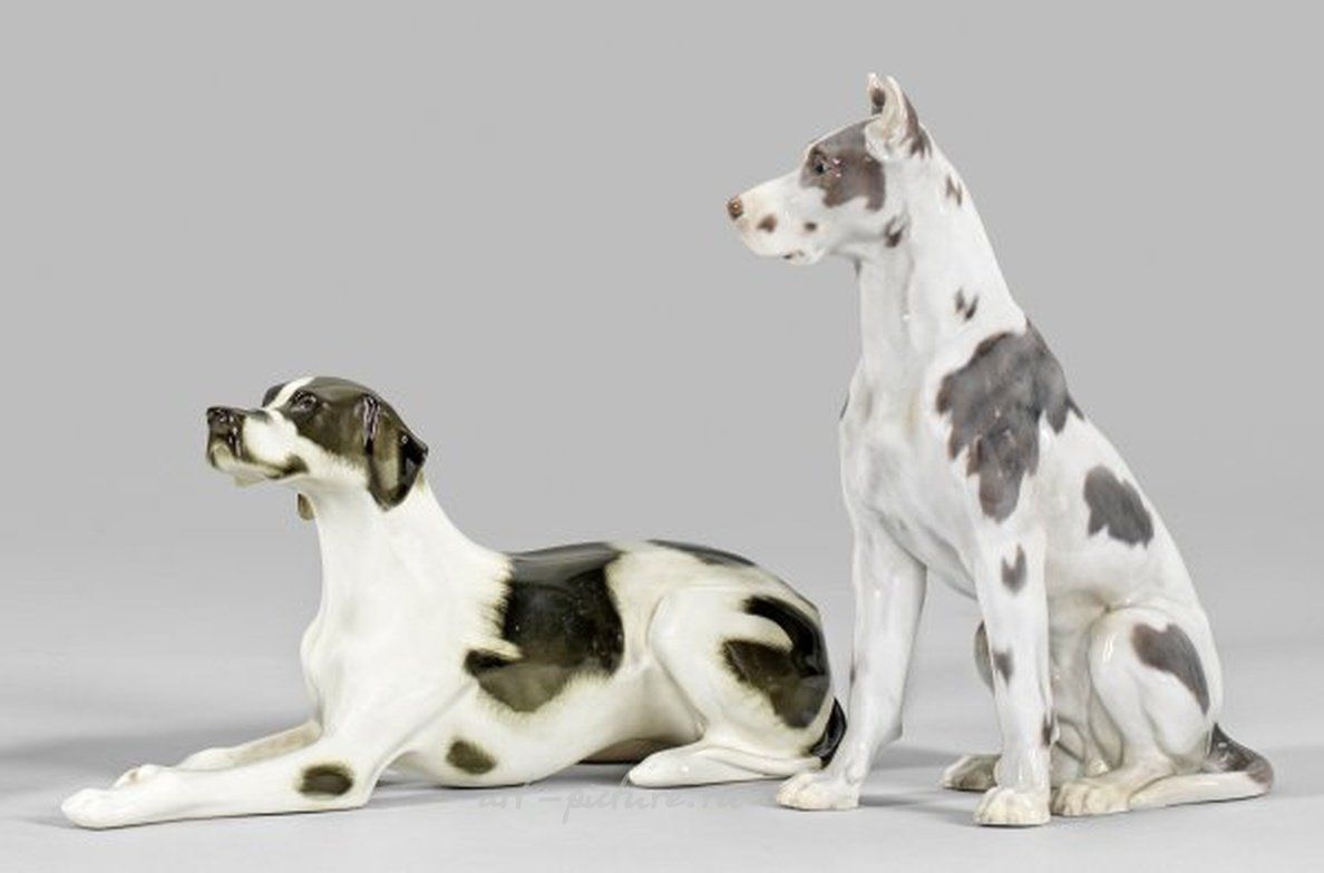 Лежащая или сидящая. Темный пятнистый рисунок на шерсти различных оттенков серого подглазурного росписи. Фабричные клейма. Высота 14,5 см - 25 см. Длина 17 см - 29 см. Два фарфоровых фигурки датской доги. Фабричное клеймо: Дания. Bing & Grøndahl / СССР (Россия). Ленинград. Ломоносов. Середина XX века.