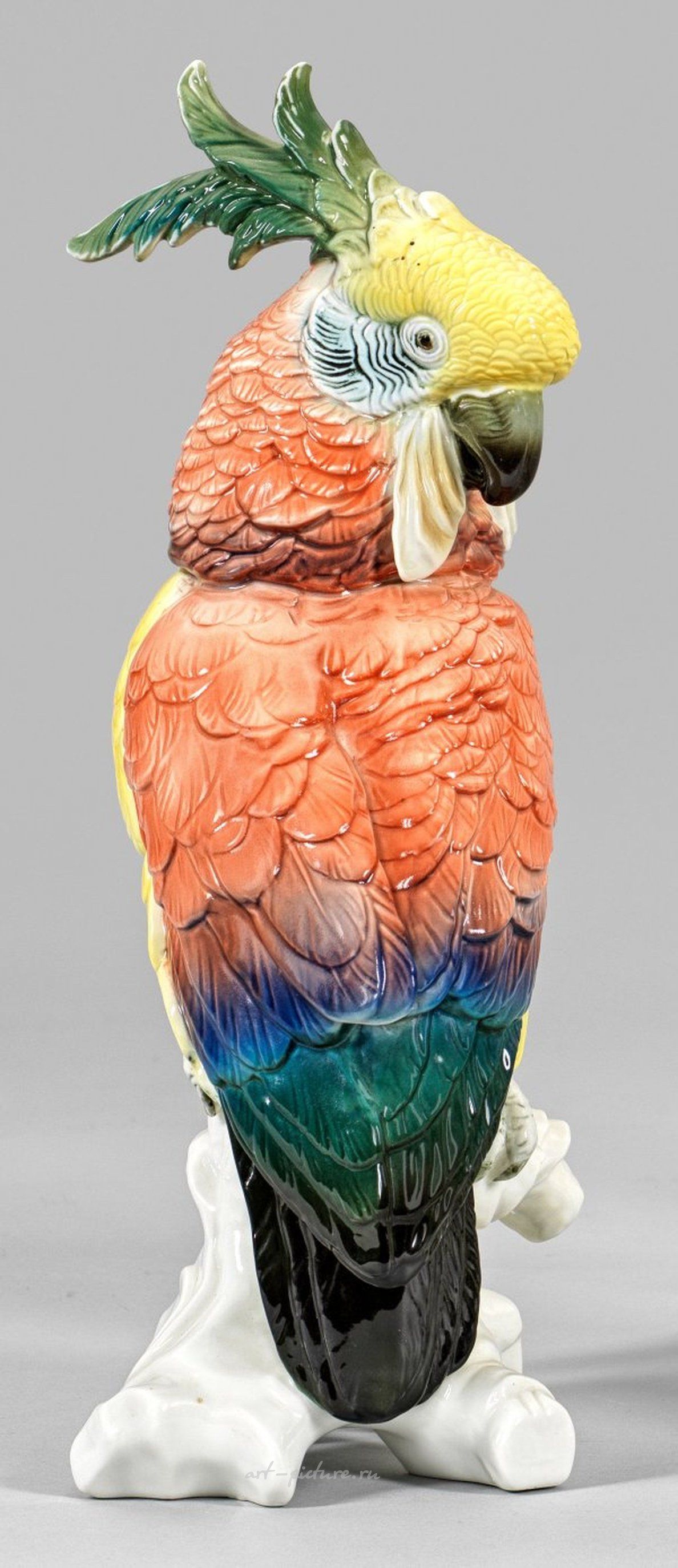 На пневматической пальме сидит какаду, повернувшая голову вправо. Рельефно украшенное, красочное оперение выполнено в полихромной подглазурной живописи. Номер модели 7141 (I). Знак производителя. Высота 37 см. Происхождение: из коллекции существенного северогерманского частного собрания. Фарфоровая фигурка какаду из Тюрингии. Знак производителя. Тюрингия. Фолькштедт. Карл Энс. Первая половина XX века.