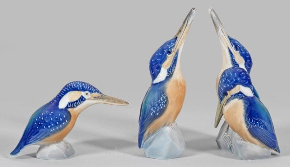 На пьедесталах. Полихромное глазурованное роспись. Возможно работы П. Герольда. Частично восстановлены и имеют незначительные повреждения. Знак производителя. Высота: 9 см - 18 см. Происхождение: Из коллекции значительной частной коллекции в Северной Германии. Коллекция из трех фарфоровых фигурок королевского завода Копенгагена, изображающих зимородка. Произведены в Дании, Королевский завод Копенгагена, около 1923 года.