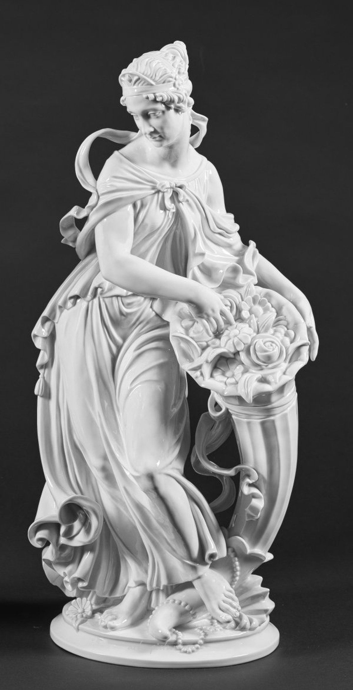 Белая фарфоровая ваза. На овальной профилированной подставке стоит молодая женщина в античной одежде, ее голова повернута вправо, в руках она держит рог изобилия с лепными цветами. Ее волосы украшены диадемой. Возможно, это работа Густава Оппеля. Возможно, помечена как "Холлоис". Марка изготовителя с синим подглазурным знаком. Высота 68 см. Оригинальная цена примерно 5 600 евро. Большая аллегорическая фарфоровая фигура, изображающая сезон "весна". Марка изготовителя с синим подглазурным знаком. Тюрингия. Старейший производитель фарфора в Волькштедте. Современный.