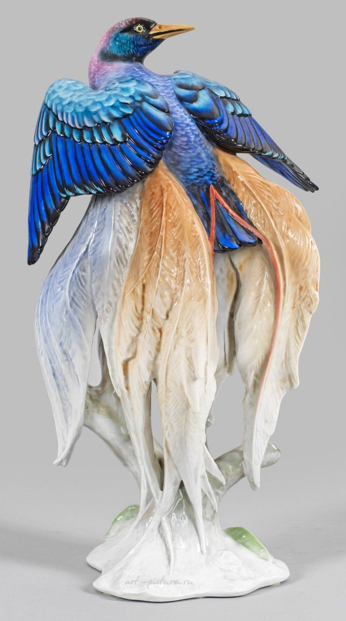 На пластиковой основе ветки сидит птица-рай с рельефным ярким окрасом оперения в голубых тонах, а также длинными пастельными перьями хвоста. Полихромная живопись. Возможно, выполнено Фрицем Хайденрайхом около 1943 года. Возможно, отмечено модельным номером 1753. Есть минимальный ремонт. Отметка производителя. Высота 47 см. Большая фарфоровая фигура птицы-рай. Незначительный ремонт. Отметка производителя: Сельб, Розенталь, около 1950 года.