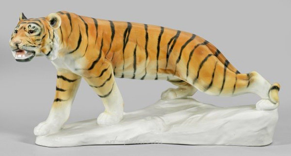 На скалистом подиуме стоит керамическая фигура тигра в стиле ар-деко. Используемый материал - камнюга. Художник изобразил тигра с натуралистичным узором меха с помощью полихромной подглазурной росписи. Из-за процесса производства на фигуре есть трещина. Изделие имеет клеймо производителя Тюрингии, конкретно Фолькштедта, и было создано фирмой Херцингер и Ко. примерно в 1930 году. Фигура имеет высоту 55 см. Происхождение этой работы искусства связано со следом существенной частной коллекции в Северной Германии.