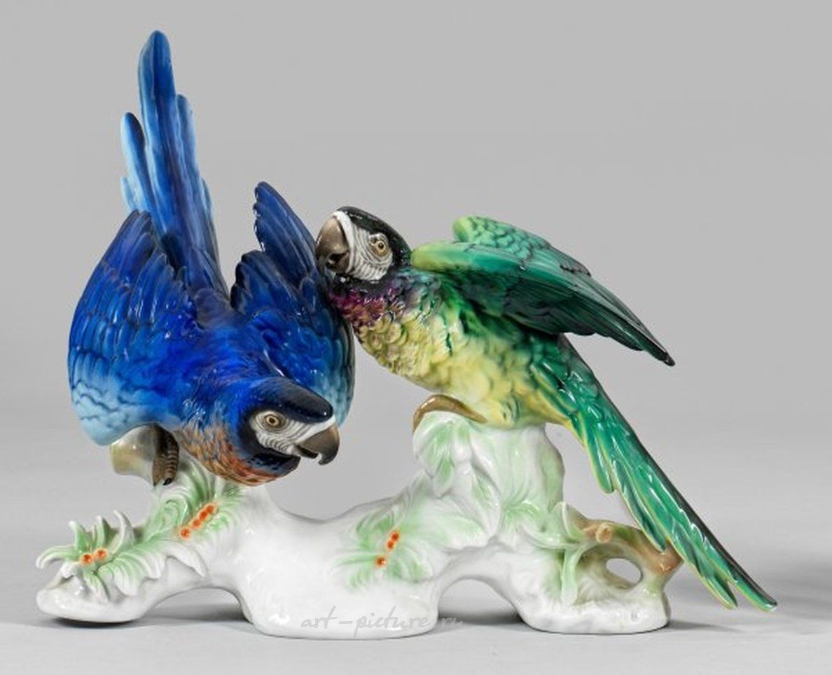 На стилизованном ветвистом пьедестале сидят две ара. Рельефное оперение. Многоцветная роспись. Возможно, автор - "О. Эндерс". Модельный номер 9380. Заводская марка. Высота 29 см. Происхождение: из коллекции значимого северогерманского частного лица. Тюрингская фарфоровая статуэтка группы попугаев. Заводская марка. Тюрингия. Унтервайсбах. Вторая половина XX века.