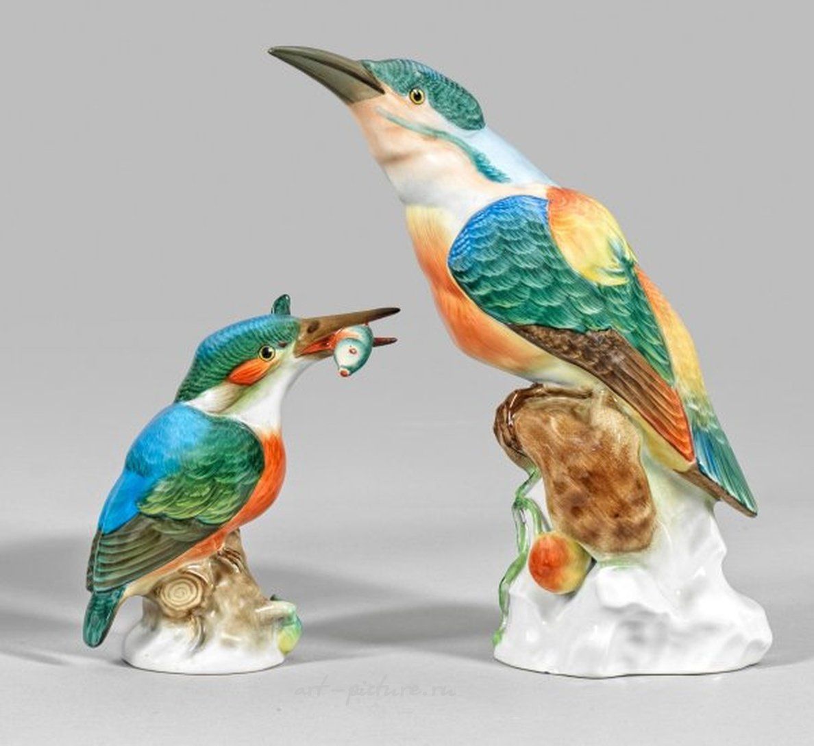 Сидя на пни дерева, частично с рыбой в клюве. Картина яркая и полихромная. Частично с минимальным восстановлением или повреждением. Марка производителя. Высота варьируется от 13 см до 22 см. Происхождение: Из состояния значительной частной коллекции в Северной Германии. Частично восстановлено или сломано. Марка производителя. Венгерский Херенд. 20 век.