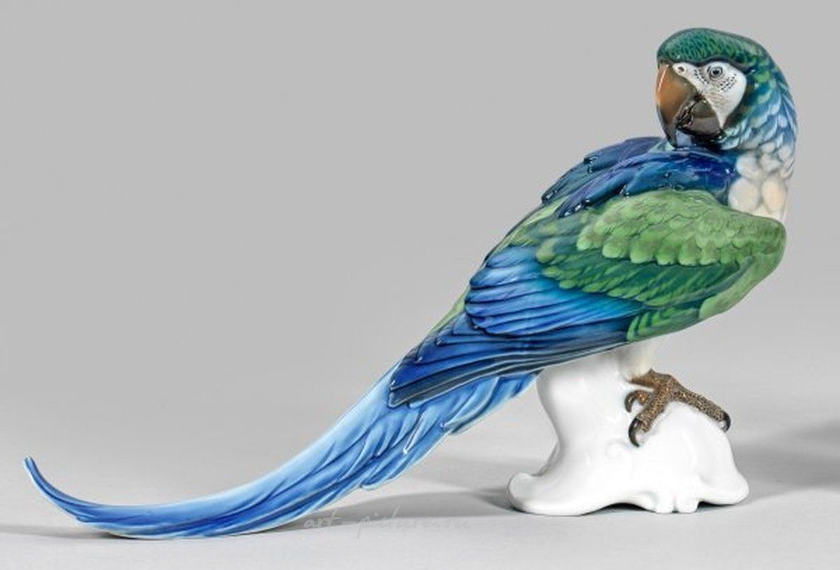 Сидя на черепной, изящно изогнутой, стилизованной ветке подставке. Оглядывается вправо, с полихромной подглазурной росписью. Возможно, выполнено Феодором Кернером, около 1923 года. С номером модели 154 и маркой производителя. Размеры: 37 см в длину. Происхождение: Из коллекции значительного частного собрания в северной Германии. Фарфоровая скульптура попугая в стиле ар-деко. Марка производителя: Selb-Plößberg, Rosenthal. Филиал "Bahnhof-Selb", 1928 г.
