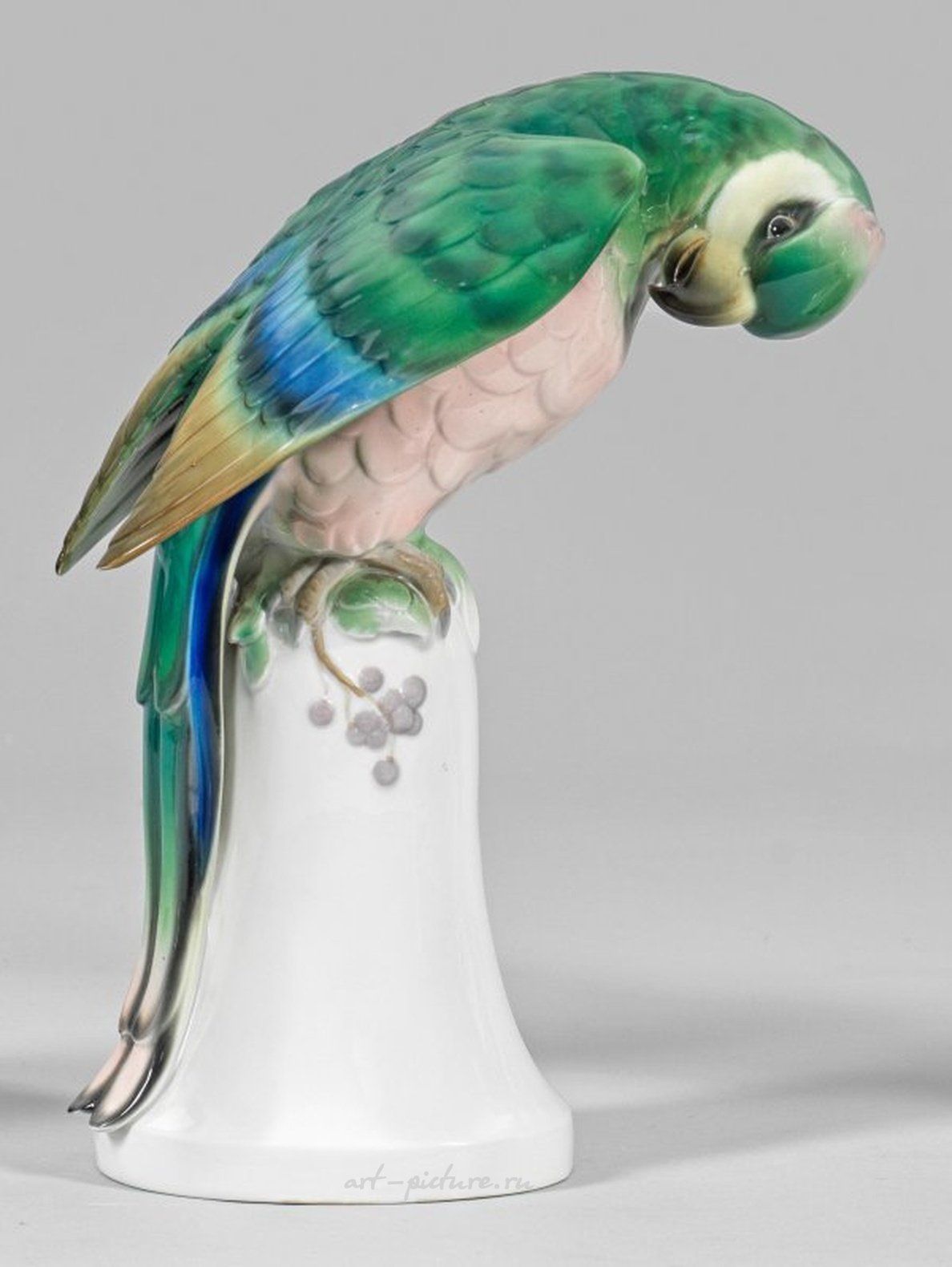 На высоком, стилизованном основании из пни дерева сидит попугай с опущенной головой. Перья слегка рельефны и красочные. Подглазурная роспись полихромная. Минимальные повреждения. Фирменный клеймо производителя. Высота: 28 см. Происхождение: из собрания значимой частной коллекции Северной Германии. Фарфоровая фигура попугая в стиле ар деко из Тюрингии. Незначительные сколы. Фирменное клеймо: Тюрингия, Бок-Валлендорф. Фасольд и Штаух. Ок. 1913-1972 гг.