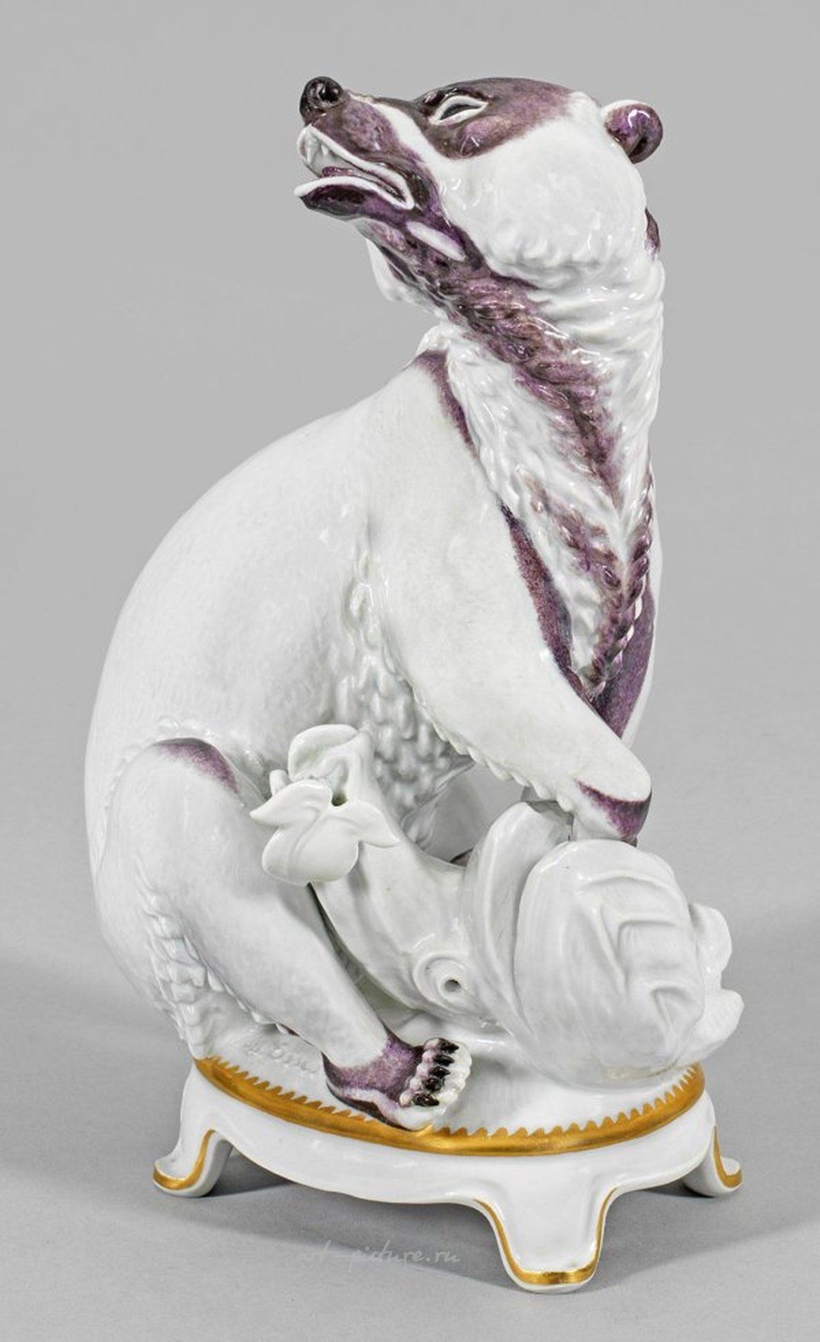 Овальный, изогнутый пьедестал с четырьмя удлиненными, языковидными ножками. На нем сидит медведь, обращенный назад, с поднятой головой и открытым ртом, показывающий свои зубы. Акцентированное покрытие фиолетовыми и коричневыми тонами с золотым контуром. Возможно, выполнено Максом Эссером, 1925 год. Возможно, помечено "M. Esser". Модельный номер H 263. Некоторое количество незначительных восстановлений; маркировка подглазурными синими перекрещенными мечами и вдавленная марка центральной части "Рейнеке Фукс". Высота 17 см, ширина 26 см, глубина 10 см. Эссер создал впечатляющий комплекс настольных предметов, состоящий из 75 частей, "Рейнеке Фукс" между 1919 и 1926 годами, основанный на эпопее Иоганна Вольфганга Гёте, которая является наиболее значимым гесамткунстверком эпохи Пфайфера с ее скульптурами животных. Торжественное оформление стола было создано в качестве подарка для президента Рейха Фридриха Эберта, посетившего мануфактуру в Мейсене в 1919 году. См. Маруш-Крон, Мейсенская фарфоровая посуда, эпоха Пфайфера, стр. 105 и далее; Й. Шерер, На грани, стр. 80 и далее. Фарфоровая фигурка медведя из центральной части "Рейнеке Фукс". Без значительных исправлений. Подглазурная синяя марка перекрещенных мечей и вдавленная марка "Рейнеке Фукс". Мейсен, около 1925-1934 года.