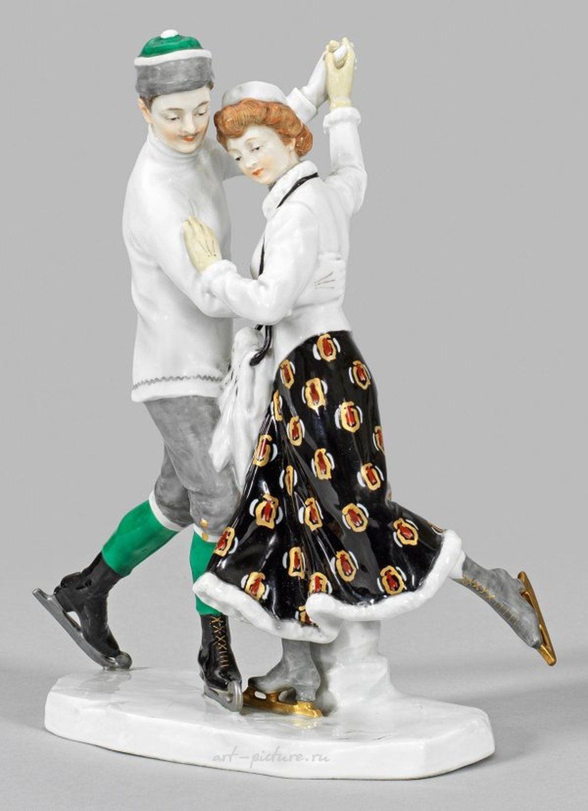 На овальной основе, имеющей форму льдинки, молодая пара танцует в широком вальсовом ритме, надевая коньки. Многоцветная подглазурная роспись украшена золотыми и серебряными штрихами. Возможно, выполнено Альфредом Кёнигом вокруг 1910 года. Модель Z 195. Незначительно восстановлено, имеется меч. Высота 21 см. Редкая пара в стиле югендштиля от Кёнига, который создал несколько отдельных фигур и групп со зимними мотивами для фарфоровой мануфактуры Мейсен в период с 1905 по 1912 годы. Альфред Отто Кёниг (1871 Рудольштадт - 1940 Мейсен) изначально работал на различных керамических фабриках в Тюрингии и Теплице. Уже в 1896 году Мейсенская фарфоровая мануфактура приобрела его первые модели, а в 1897 году приняла его на работу модельером. Помимо фигур с зимними темами, в широкий творческий наследия Кёнига входили японские группы, дети и костюмированные фигуры, модели моделей и атлетов. Он был одним из самых важных дизайнеров стиля югендштиль своего времени. См. Jedding, Meissener Porzellan des 19. und 20. Jhs., стр. 111 (модельный номер 196, вариант); Just, Meissener Jugendstil Porzellan, стр. 157. Фарфоровая группа в стиле ар-нуво изображает пару танцующих фигуристов. Минимально восстановлена. Марка перекрещенных мечей. Мейсен. Около 1910-1923 гг.