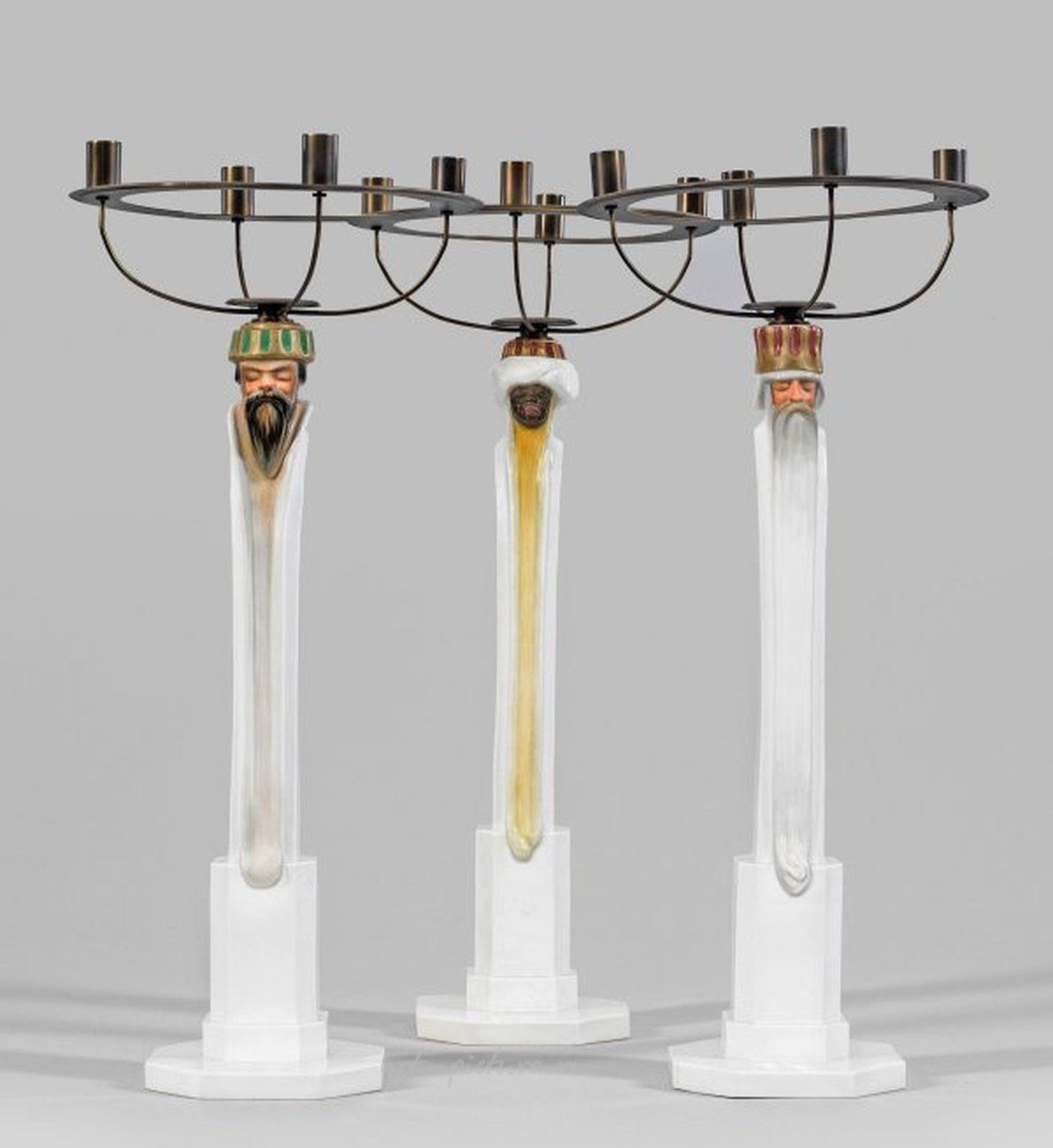 Майссен 1 - или 4-частный; вознесение на ступенчатом восьмиугольном постановлении, тонкий стержень с головой длиннощетинистых мудрецов из востока. Гаспар, Мельхиор и Валтасар с съемными, изогнутыми, четырехгорлыми подсвечниками из латуни. Полихромное роспись с золотыми акцентами. Сделано, возможно, Эрихом Клейнхемпелем в 1903 году. Модель №Т 197. Подсвечник дополнен; марка меча. Высота от 44 см до 55 см. Представленные в текучем, линейном фор-мальном языке фигуры являются замечательным примером майссенского югендстиля и отражают возникающую художественную волю около 1900 года. Фридрих Эрих Клейнхемпель (1874-1947) работал как самостоятельный художник на фарфоровой мануфактуре Майссена. Он учился в Дрезденской школе искусств и ремесел с 1890 по 1893 год, был вовлечен в основание частной художественно-ремесленной школы в Дрезден-Штризене в 1900 году и участвовал в основании Дрезденского художественного объединения в 1909 году. С 1912 года он взял на себя руководство художественно-ремесленной школой и художественно-ремесленным музеем в Бремене. Многогранный Клейнхемпель также разрабатывал ткани, мебель, стекла и обложки книг, среди прочих вещей. В 2000 году мануфактура Майссен вновь представила три подсвечника в стиле югендстиля, входящие в издание "ZeitZeichen". См. Just, Meissen Jugendstil Porcelain, стр. 60; Байер, ZeitZeichen, Майссен Манускрипты XIV, стр. 66; Художественный музей г. Филадельфия, INV. 1964-216-1a, b, 1964-216-2a, b, 1964-216-3a, b. Три подсвечника с отделяемым монтажом, выполненными по модели "Три мудреца" Ф. Э. Клейнхемпеля в 1903 году. Подсвечник дополнен. Марка "перекрещенных мечей". Майссен. Около 1903 года.