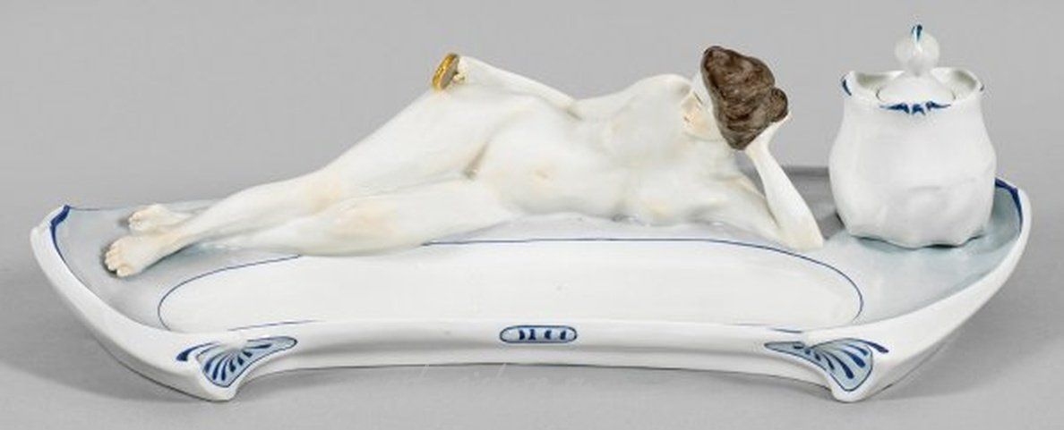Длинный, изящно изогнутый подставка для пера с почтительной круглой ямкой для перьев, сопровождаемая пригодным чернильницей с стилизованной ручкой в виде бутона. Вентиляторообразный акцентированный декор в стиле Ар Нуво. Над ним - полностью скульптурное изображение полулежащей женской наготы, которая размышляет о себе в зеркале. Скудная разрисовка надглазурными красками в синих тонах с тонкими золотыми акцентами. Возможно, автором является Артур Ланге (1875-1929), 1903 год. Номер модели T 180. Идентифицированное реставрирование; марка пересекающихся мечей. Высота 9,5 см, 36 см x 16 см. Скульптор Артур Ланге (1875-1929) учился в Мейсенской Драфтинговой школе и Модельной академии с 1891 по 1895 годы. С 1895 по 1898 год он учился в Дрезденской Школе искусств и ремесел. С 1898 года работал модельером в Мейсене, пока не покинул завод в 1908 году, чтобы работать независимым скульптором в Дрездене. См. Джеддинг, Фарфор Мейсен XIX - XX века, стр. 155. Фарфоровая подставка для пера в стиле Ар Нуво с чернильницей, украшенная фигурой обнаженной женщины. Незначительно восстановлена. Марка пересекающихся мечей. Мейсен. Около 1903-1923 гг.