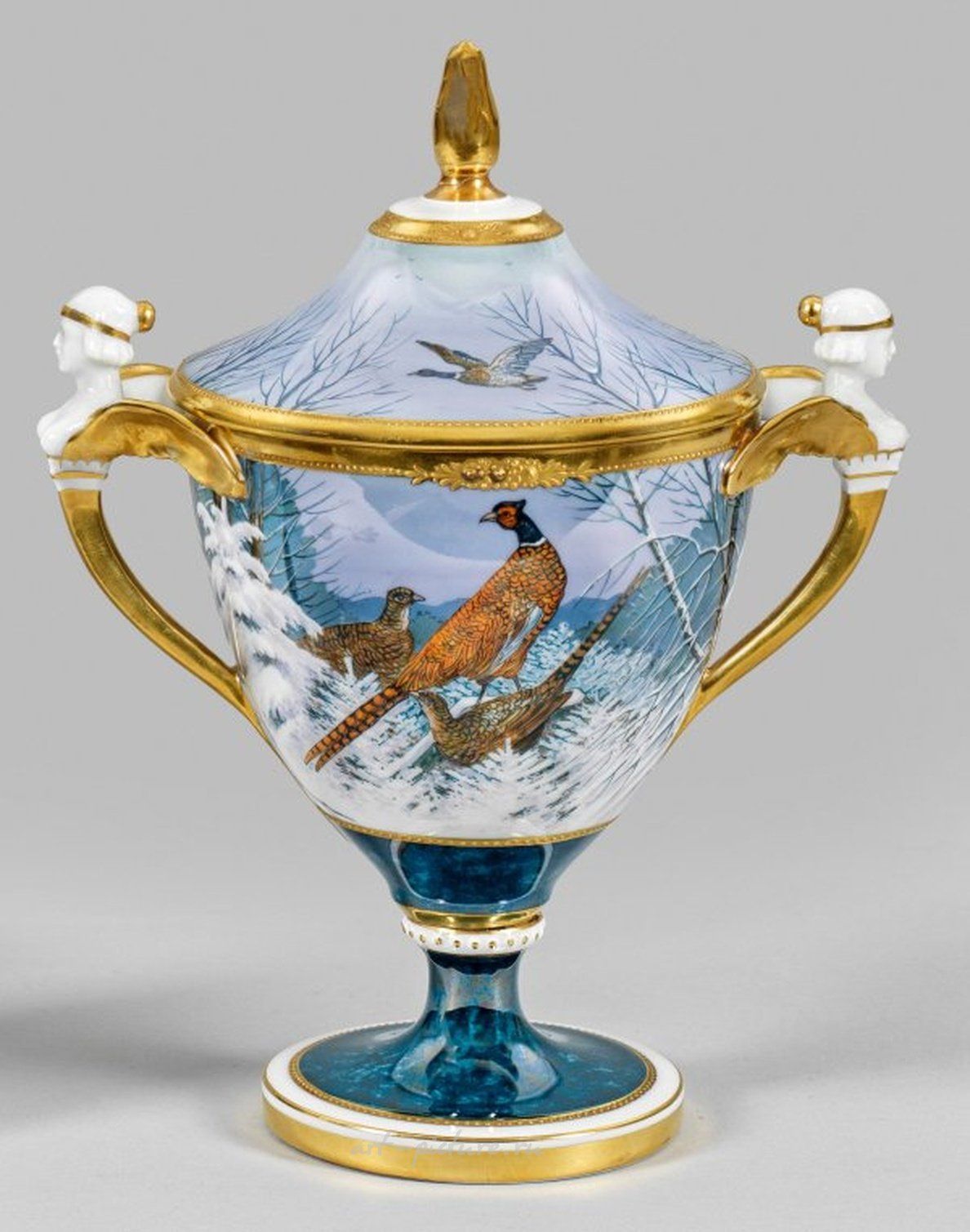 Живописное отделение Дрездена, созданное Освальдом Миршем. Форма кубка со сторонами, с боковыми изогнутыми ручками с изображением женских бюстов. На стене - окружающий зимний пейзаж с мартышками или фазанами в полихромной, металлической переливающейся, похожей на перламутр, глянцевой живописи. Рельефная золотая отделка. Основана на исторической модели номер 744 (около 1800 года). Декорационный номер M 275. Ручка восстановлена. Отметка производителя. Высота 25,5 см. С крышкой ваза из фарфора в стиле ар-деко с полихромной покрытой глянцевой живописью от мастерской живописца Дрездена Освальда Мирша. Отметка производителя - Фюрстенберг. Около 1926 года.