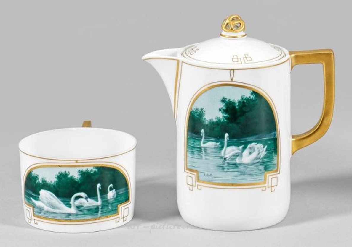 "Редкий кофейник и чашка в стиле модерн с декором "Лебеди в зеленом"",