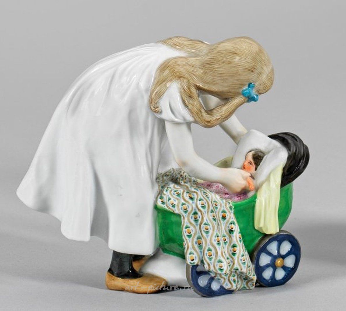 Тема: Анализ фарфоровой фигуры из Мейсена "Хенчелкинд" Обсуждаемая фарфоровая фигура из Мейсена, известная как "Хенчелкинд", изображает молодую девочку, стоящую в длинном белом платье, внимательно укладывающую свою куклу в коляску. Фигура характеризуется естественной формой и тщательно изготовлена с помощью техники многоцветной глазурированной живописи. Палитра цветов состоит из оттенков зеленого, голубого, желтого и охры, с добавлением мотивов глаз павлина на крышке коляски. По бокам находится подходящая зеленая подушка, гармонирующая с общей цветовой гаммой. Эта особая фарфоровая фигура из Мейсена, с ее изящными золотыми деталями и тонкими золотыми украшениями, является продуктом изысканного мастерства Мейсенской мануфактуры. Ее авторство приписывается Конраду Хенчелю или Юлиусу Конраду Хенчелю и датируется 1905 годом. Модельный номер, присвоенный этому изделию, - W 124. Фигура была создана в качестве памятного изделия ко двухсотлетию основания мануфактуры, что подтверждается символом перекрещенных шпаг, символом Мейсена. Фигура "Хенчелкинд", имеющая примерно 12,5 см в высоту, до сих пор пользовалась популярностью среди коллекционеров и энтузиастов фигур в стиле Югендштиль Мейсена. Эта серия фигур детей, созданная Юлиусом Конрадом Хенчелем в период с 1904 по 1907 годы, изображает как маленьких детей, так и подростков в различных повседневных ситуациях. Переплетенные рукописи Мейсена, в частности особое издание III, включают иллюстрации этой впечатляющей коллекции маленьких и растущих детей. В заключение, эта фарфоровая фигура, мастерски созданная К. Хенчелем в 1905 году, представляет собой значимое изделие в коллекции Мейсена. Ее внимание к деталям, естественная форма и художественное исполнение делают ее ценным предметом как для ценителей искусства, так и для энтузиастов Мейсена. Символ перекрещенных шпаг также придает ей историческую и художественную ценность.