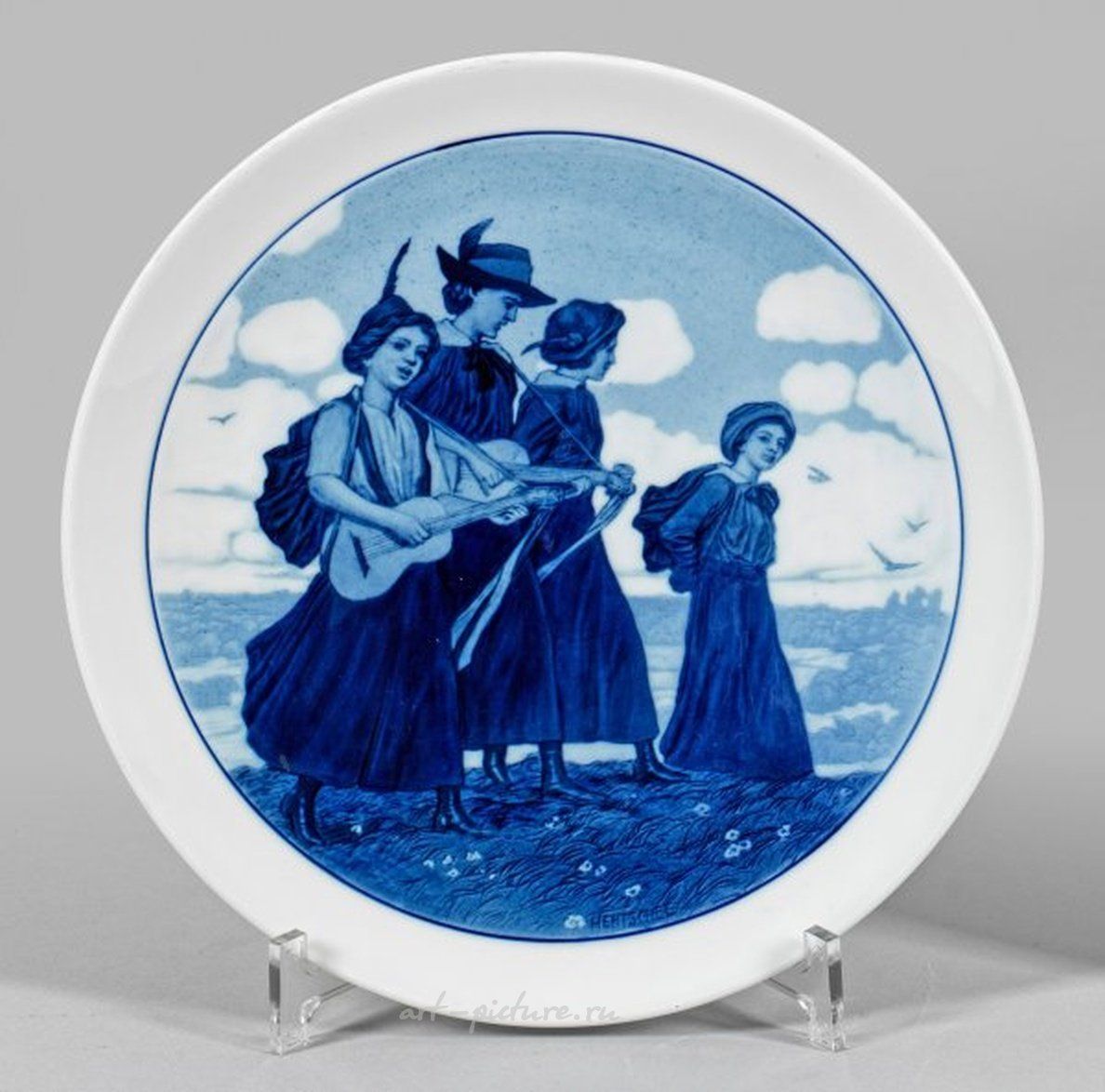 Круглая форма. На плоском, вдавленном зеркале, выделяется рельефная медальонная рамка, внутри которой изображены четыре девушки, играющие на музыкальных инструментах в многоцветной, голубой подглазурной росписи. Декор - возможно, выполнен по мотивам Рудольфа Гентшеля. Подпись "HENTSCHL". Вешалка на стену. Мечевая марка. Диаметр 25 см. Фарфоровая тарелка с живописью сцены в голубой подглазурной росписи. Маркировано перекрещенными мечами. Мейсен. Около 1935-1945 гг.