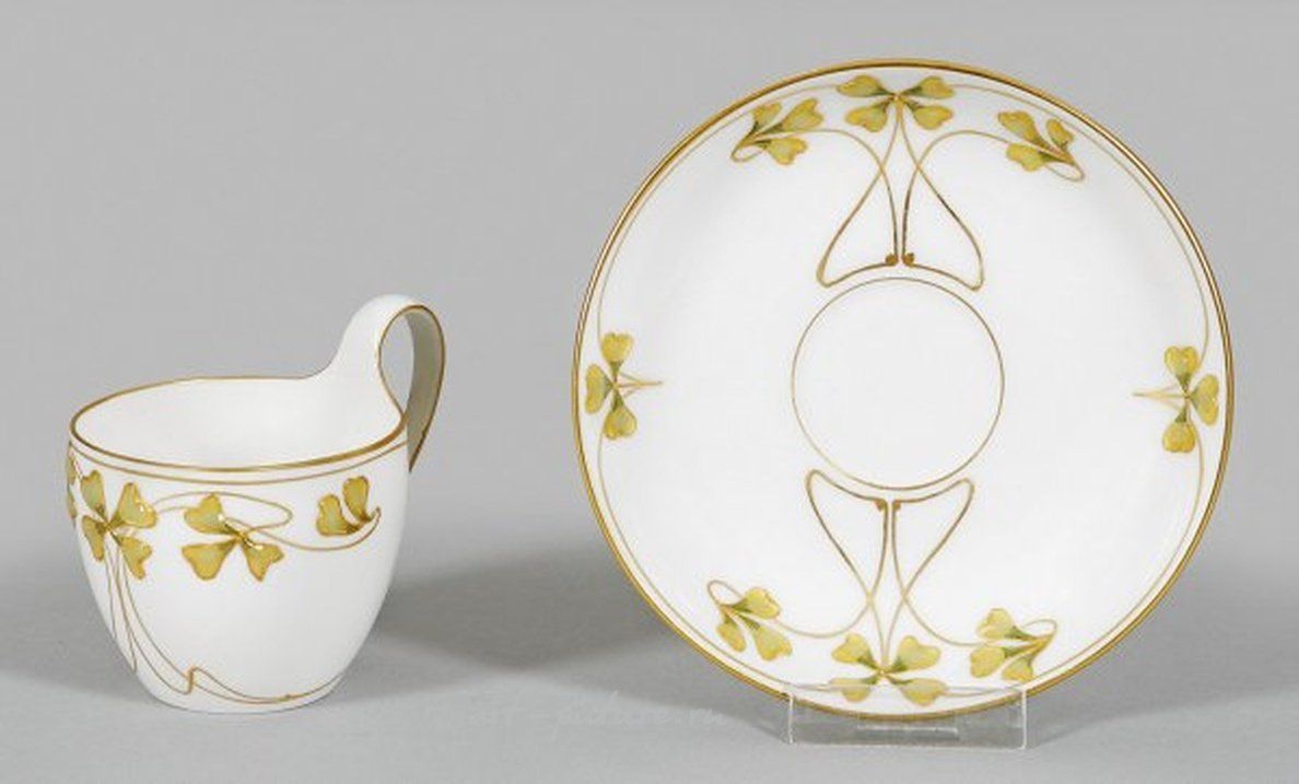 На блюдце. Форма колокола с высокой ручкой. На стене и в зеркале аксиально симметричный, стилизованный декор из светло-зеленой эмалировой росписи клеверного листа на золотом фоне с тонкими золотыми краями. Декор - Фридрих Кёниг либо 1902 год. Буква года B. Скипетр и марка художника. В. 6,5 см. С этим декором клеверного листа изначально была создана также позднее сервизная посуда, так называемый сервиз в форме "Ленточных лент". См. каталог Брёханского музея, V/I, № 101; И. фон Тресков, "Югендстиль-порцелан", № 66 и стр. 295, № 6979. Арт-нуво чашка для моки с стилизованным декором клеверного листа. Дата-марка. Скипетр и марка художника. КПМ-Берлин. Около 1902 года.