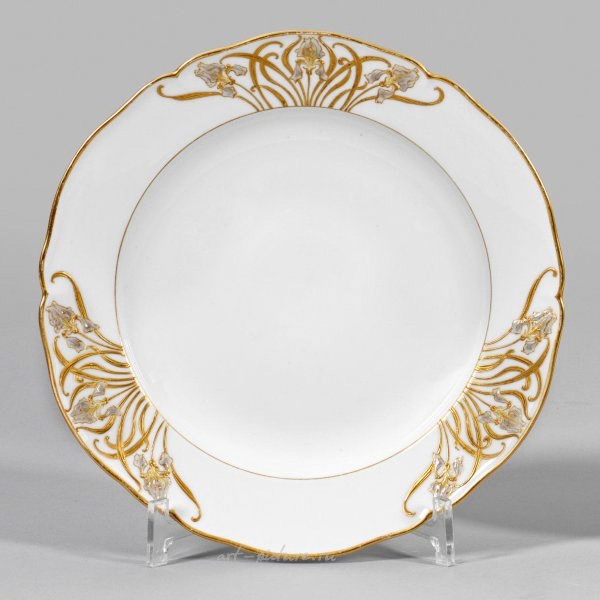 Круглая, изящная форма. На флаге тройной, аксиально симметричный узор из виноградной работы, тонко обведенный золотыми линиями с лилейными цветками из цветного эмалевого бисера, так называемой ювелирной фарфоровой эмали. Полихромная эмалевая живопись в лиловом тоне с ноткой желтого. Художник-маркировщик Пауль (Герман) Маковиц (работал в KPM с 1891 года). Скипетр и маркировка художника. Диаметр 24,5 см. "Ювелирный" и позолоченный фарфоровый тарелка в стиле модерн с стилизованным цветочным эмалевым украшением. KPM Берлин. Около 1900 года.