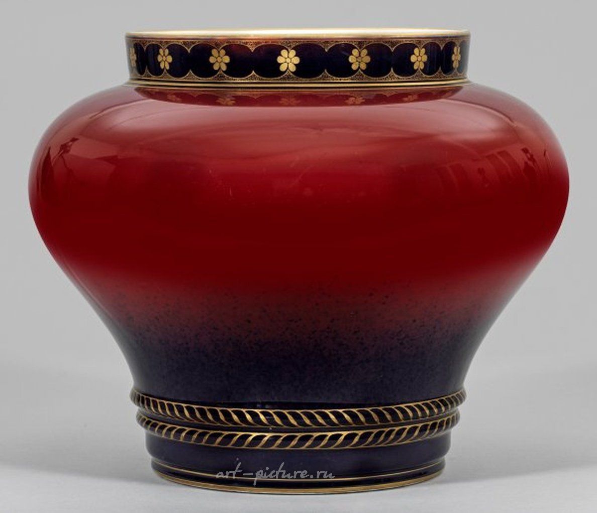 Сегерский фарфор. На круглом основании компрессированное, балочно-образное, нижнее тело, которое состоит из двух рядов профилированных колец. С короткой шеей. Кобальтово-синий, со специями, перетекающий в африканский оттенок сверхглазури по китайскому стилю. Подставка и шея выделены окружающими, частично замшелыми золотыми краями. Жезловой знак с печатью Сегера. Высота 34 см. Диаметр тела около 42 см. Происхождение: предмет из частной коллекции в Берлине. См. И. фон Тресков, каталог "Югендстиль Порцелланы КПМ Берлин", номер 3; Брёхан Музей, том VI, стр. 104 и далее. Большая ар-нуво кобальтово-синяя и малиновая ваза из Сегерского фарфора с золотым декором. Жезловой знак с "SgrP" (печать Сегера). КПМ-Берлин. Около 1900 года.