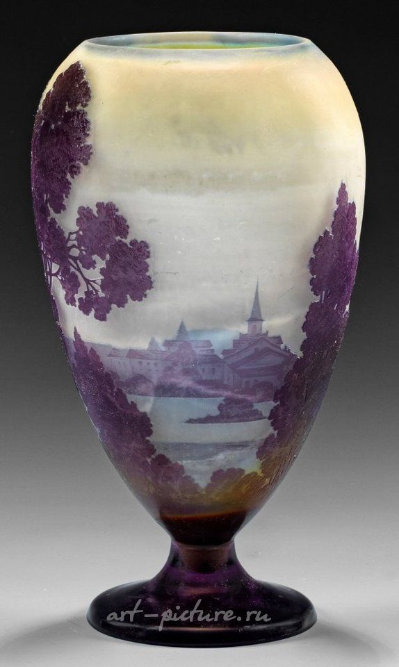 Корпус Спицовида на колоколообразной основе. Стекло с наложением, бесцветное, янтарно-желтое, голубое и фиолетовое. В нескольких этапах травления и полировки, украшено завесным мотивом вечернего пейзажа озера (вероятно, озера Комо), с видом на лесистый берег и монастырь. Подписано "Gallé". Высота 25,5 см. Декор вазы связан с вазами из серии "Лак де Комо", с изображением озера Комо. Французская камея с гравировкой и травлением от Gallé, украшенная видом озера (похожим на серию ваз Lake Como). Подписано. Франция, Нанси. Этаблиссеман Галле. Около 1925-1930 годов.