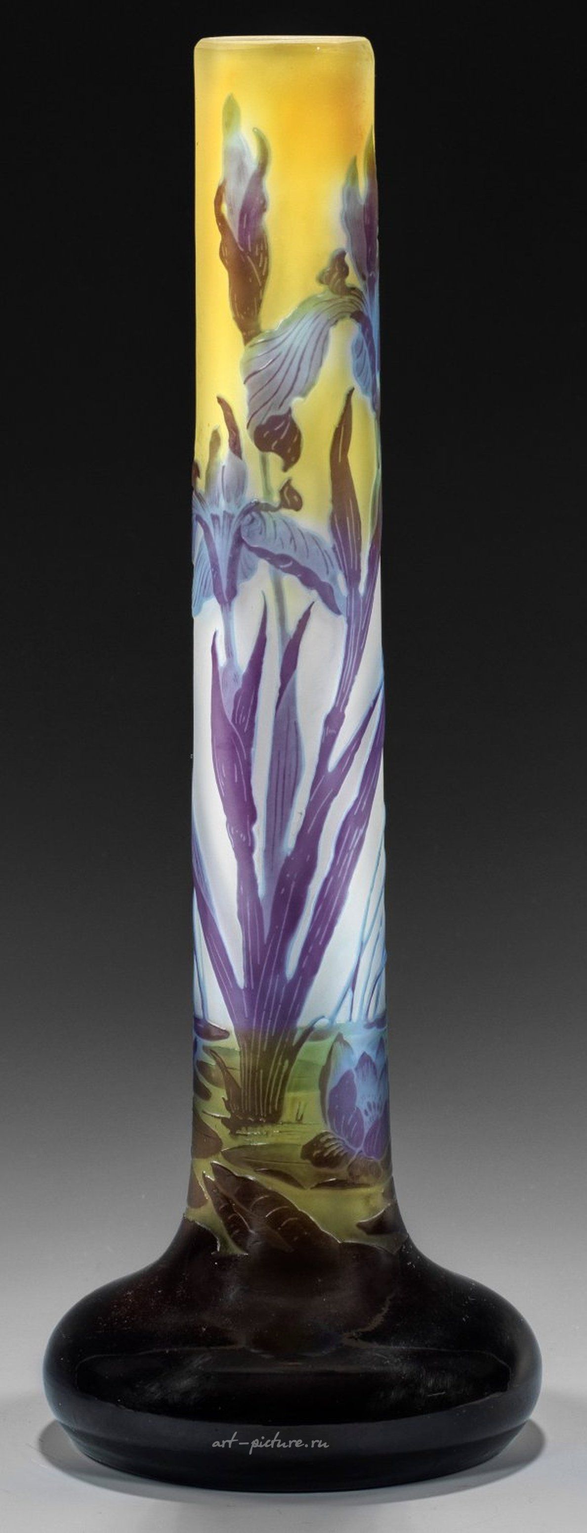 Пейзаж пруда с пленками Оверфанга, бесцветный, светло-голубой, темно-фиолетовый и желтый. Выполнено несколькими рабочими процессами, травленая и полированная декорация пейзажа пруда с цветущими стеблями ириса и озерными или прудовыми розами. Подписано "Галле". Высота 33,5 см. Большая французская ваза в стиле ар-нуво с травлением и камеей с прудовым пейзажем, ирисами и кувшинками от Эмиля Галле. Подписанный. Франция. Нанси. Эмиль Галле. Около 1900-1914 года.