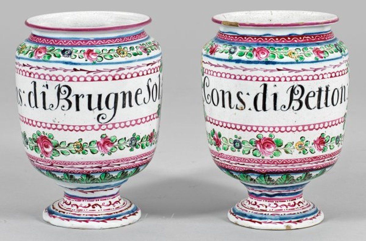Маджолика. Цилиндрической формы, на профилированной колокольной ножке. Полихромная декорация в яркой и приглушенной живописи в орнаментальных и цветочных мотивах с розами и цветами роз, каждая демонстрирует широкое поле с черной надписью "Конс: ди Беттон:" или "Кон: ди Бругне Сол:". Сосуд находится в немецком владении; высота - 17,5 см. Пара итальянских, вероятно, падуанских, аптечных глиняных банок маджолики с полихромным декором. Незначительные сколы на одной банке. Итальянские, вероятно, падуанские, вторая половина 18 века.