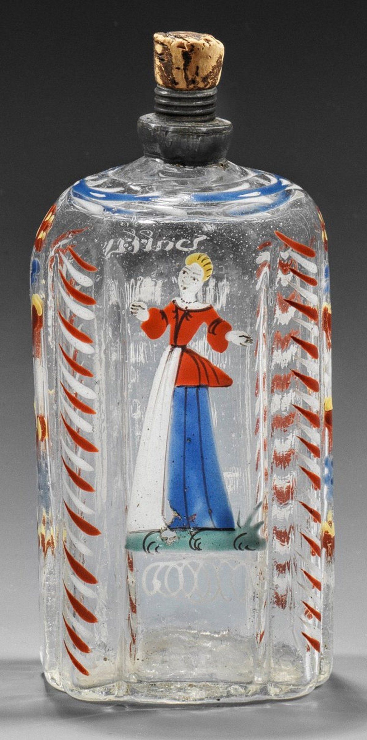 Бесцветное, слегка сероватое стекло с осколками на земле. Прямоугольная форма с отделанными углами, скругленным плечом и наборным жестяным носиком. Многоцветная цветочная мозаика, нанесенная непрозрачной эмалью. На передней стороне изображена танцующая женщина в длинном платье, видимая сзади. Надпись: "(...) мужчина или я убегу оттуда". Боковые узоры в стилизованной растительной форме. Высота: 14.5 см. Бутылка для ликера в южногерманском или альпийском стиле с многоточечной эмалью и наборными элементами из жести. Южная Германия/Альпы. XVIII век.