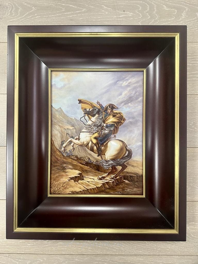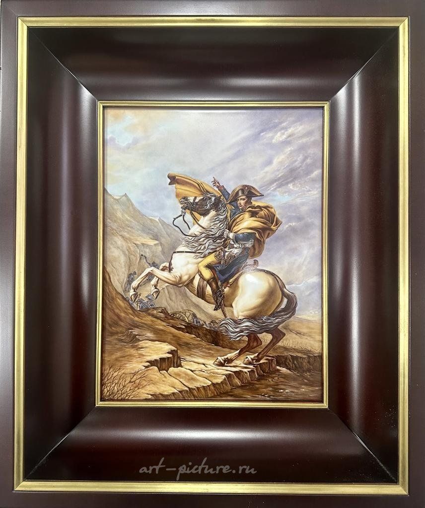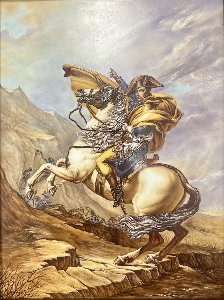 Фарфоровый пласт с живописной миниатюрой «Бонапарт на перевале Сен-Бернар» Художественная мастерская Л.А. Быстрицкой. Место создания: Россия, Санкт-Петербург. Время создания: 2008 г. Исполнитель живописи - Анна Рзянина. Размеры: пласт - 30х40 см. Материал: фарфор, формовка, глазурь, обжиг. Техника исполнения: полихромная надглазурная живопись Рама -56 х 66 см, древесина красного дерева, бронза, лакирование. На тыльной стороне пласта надпись: "Художественная мастерская Лады Быстрицкой копия с картины "Бонапарт на перевале Сен-Бернар " 1801г. Жак Луи Давид. Исполнитель росписи Анна Рзянина 2008 г.» Живописная миниатюра на пласте фарфора (картина) исполнена в Художественной мастерской Лады Быстрицкой художником по фарфору Анной Рзяниной, по мотивам всемирно известного произведения французского живописца Жака Луй Давида (1748, Париж - 1825, Брюссель), созданного в 1801 году. На конном портрете «Бонапарт на перевале Сен-Бернар», легендарный Наполеон Бонапарт представлен художником как романтизированный герой, бросающий вызов силам природы. Ж.Л. Давид впервые в живописном произведении соединил академическую «гладкую» манеру письма с романтическим содержанием и театрализованной композицией. Наполеоника.