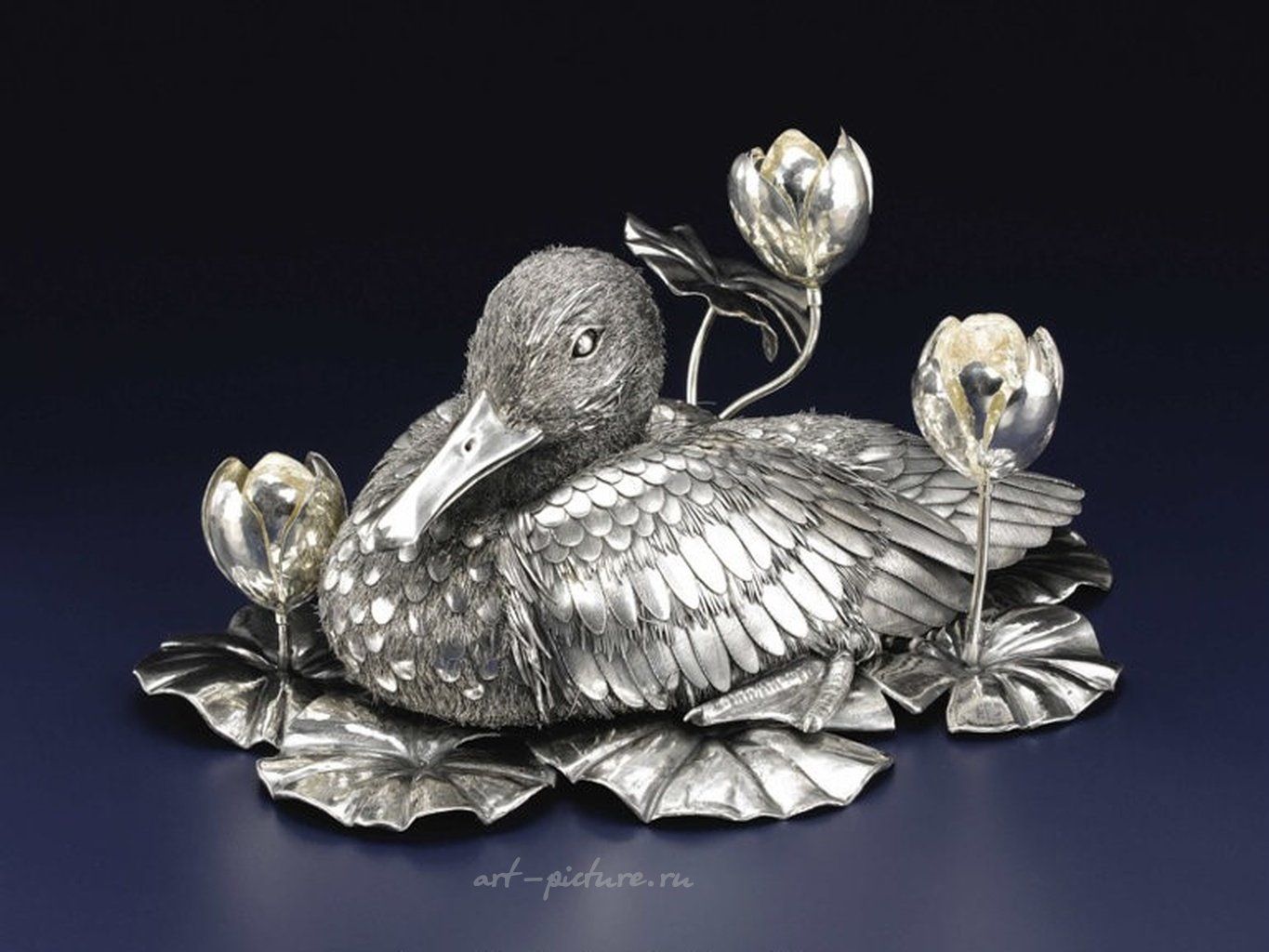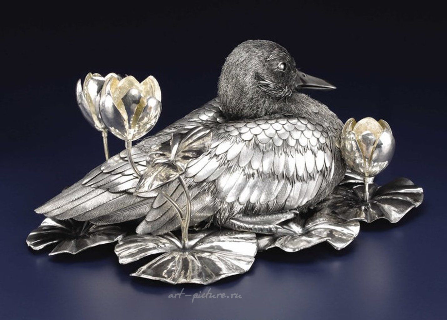 Buccellati Скульптурная композиция Утка лежащая. Серебро, филигрань, ручная проработка, золочение, выс.- 15 см., дл.- 31 см., вес изделия -924,27 гр. Италия XX век.