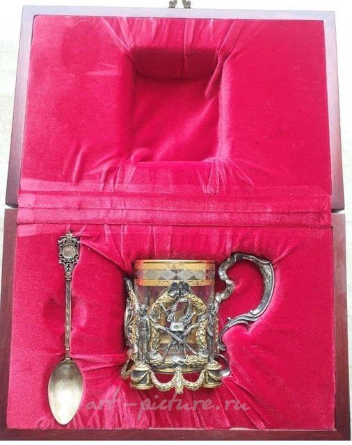 Необходимо отметить, что стиль, в котором выполнен этот предмет, безусловно, можно отнести к имперскому стилю, характерному для эпохи, когда искусство служило отражением могущества и величия. Имперский стиль, с его обилием деталей и роскошными акцентами, показывает стремление к величию и высокому качеству исполнения. Это видно как в самом подстаканнике, так и в кружке, которая явно выделяется своей великолепной ручкой и изысканными рельефными узорами.