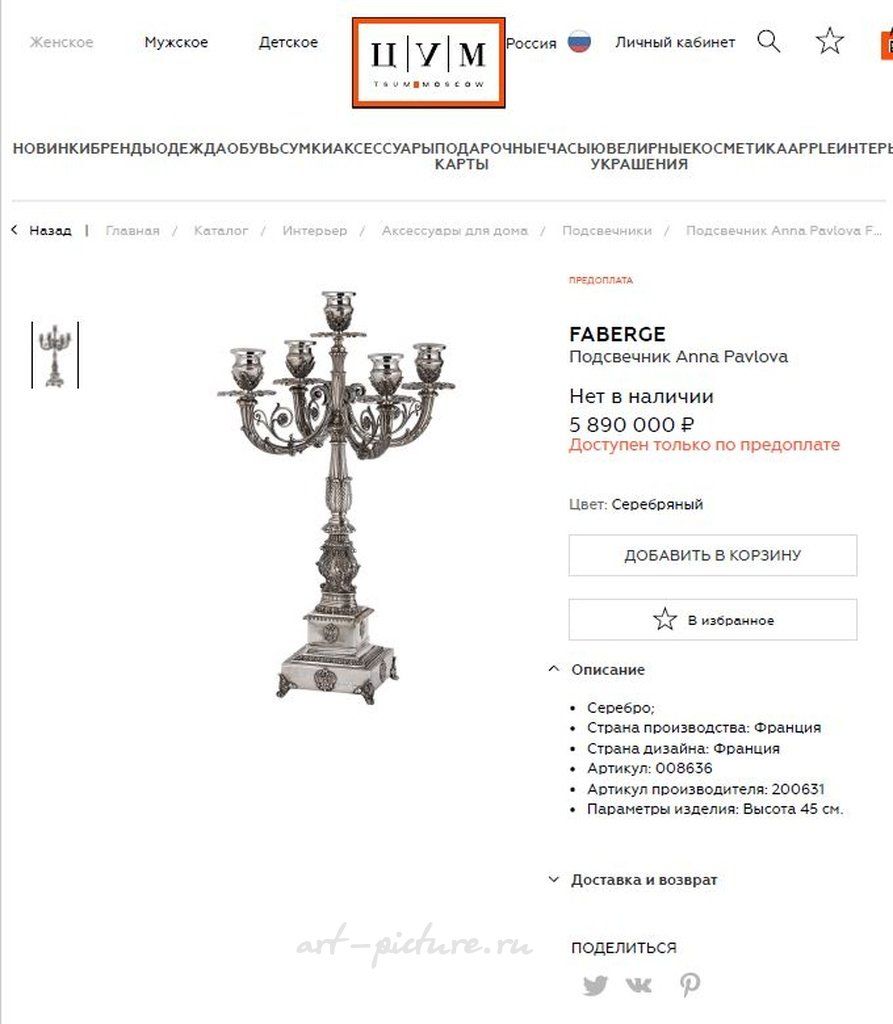 Подсвечник Анна Павлова Anna Pavlova, Faberge, Фаберже, серебро Страна производства: Франция Страна дизайна: Франция Артикул производителя: 200631 Параметры изделия: Высота 45 см. В настоящее время Faberge Фаберже больше не производит подобные предметы. Канделябр является редким предметом музейной ценности и привлекательным объектом для коллекционирования и инвестирования средств. Доступна пара таких подсвечников.