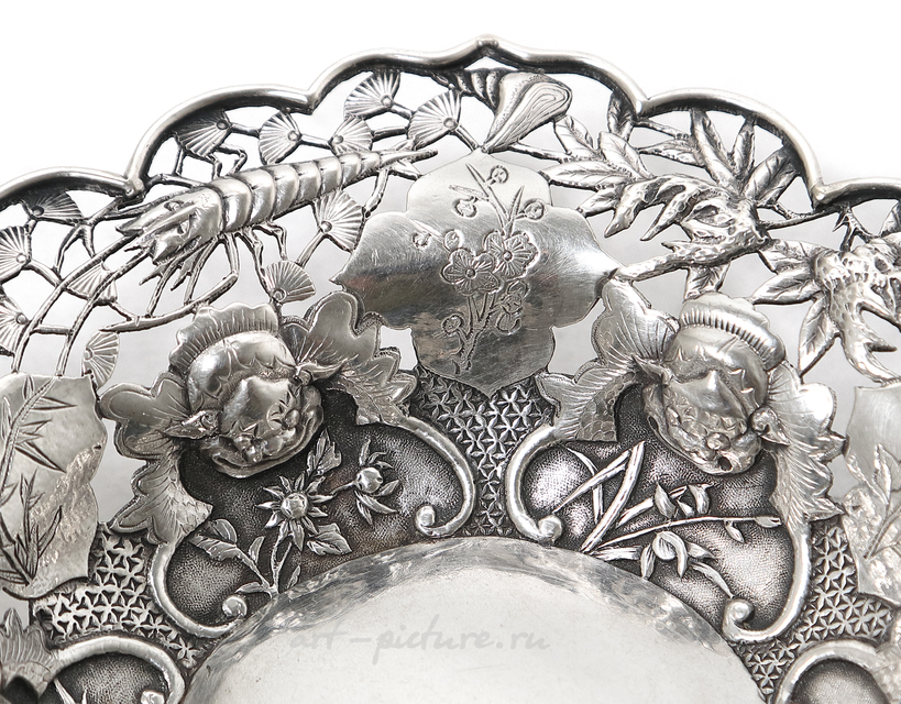 Первое, что привлекает внимание в этом уникальном серебряном блюде, — это, безусловно, его ручная работа. В эпоху, когда технологии предполагали массовое производство, данное блюдо, выполненное в Китае, вероятно, около конца XIX — начала XX века, представляет собой реликвию мирного времени, когда каждый предмет с любовью создавался руками мастеров. Как истинный коллекционер антиквариата, я всегда ощущаю глубокий трепет, понимая, что за каждым изделием стоит история, культура и традиции не одного поколения.