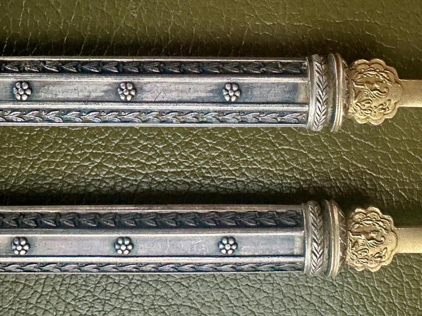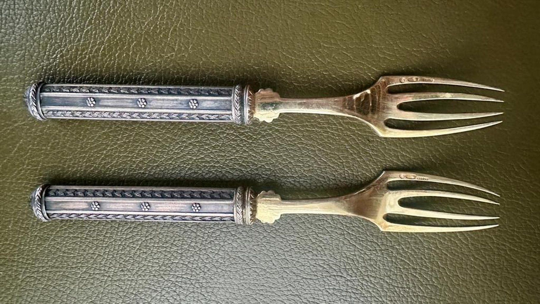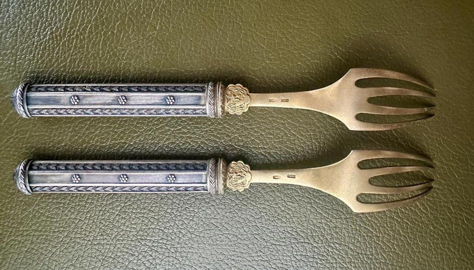 комплект вилок, серебро, 2 шт., 84 проба, общий вес изделий 123, 18.2 см, торговый дом фабрики "Болин", 1896-1907 г., Москва, Российская империя Пара вилок фабрики Болин. Есть в истории русского ювелирного дела имена, навечно вписанные в историю искусства. Таковым является Карл Болин. Фирма "Болин" занимает особое место в истории русского ювелирного искусства. Она была создана в конце XVIII столетия в Петербурге. С 1839 г. Карл Эдуард Болин - придворный ювелир, с 1851 г. - оценщик Кабинета, в 1862 г. ему присваивается звание потомственного почетного гражданина. Предмет уникальный, музейного достоинства! Фигура сфинкса и другого мифического персонажа выполнены на очень высоком художественным уровне. Предмет богато декорирован гирляндами, цветами жемчужника, остролистами, родная двухцветная позолота. Состояние превосходное! Шедевр! Длина: 18 см. Вес: 123 гр. Пробирное клеймо «Женская голова в кокошнике в профиль, направленная вправо» в овальном щитке = удостоверяет, что изделие изготовлено и апробировано в России в период с 1908г по 1917г. Литера греческого алфавита «Дельта», сопровождающая пробирное клеймо в одном контуре = устанавливает, что изделие было апробировано Московским пробирным округом, в состав которого входили Нижегородский Губернский пробирер и Тульский Губернский пробирер. Пробирное клеймо «Женская голова в кокошнике в профиль, направленная влево» = удостоверяет, что изделие изготовлено в России в период с 1896г по 1908г. Клеймо «84» = золотниковая проба в клейме удостоверяет, что изделие изготовлено из высокопробного серебра. Клеймо «BOLIN» = фирменный именник торгового дома фабрики Болин. На предмете дополнительно проставлены клейма советского периода.