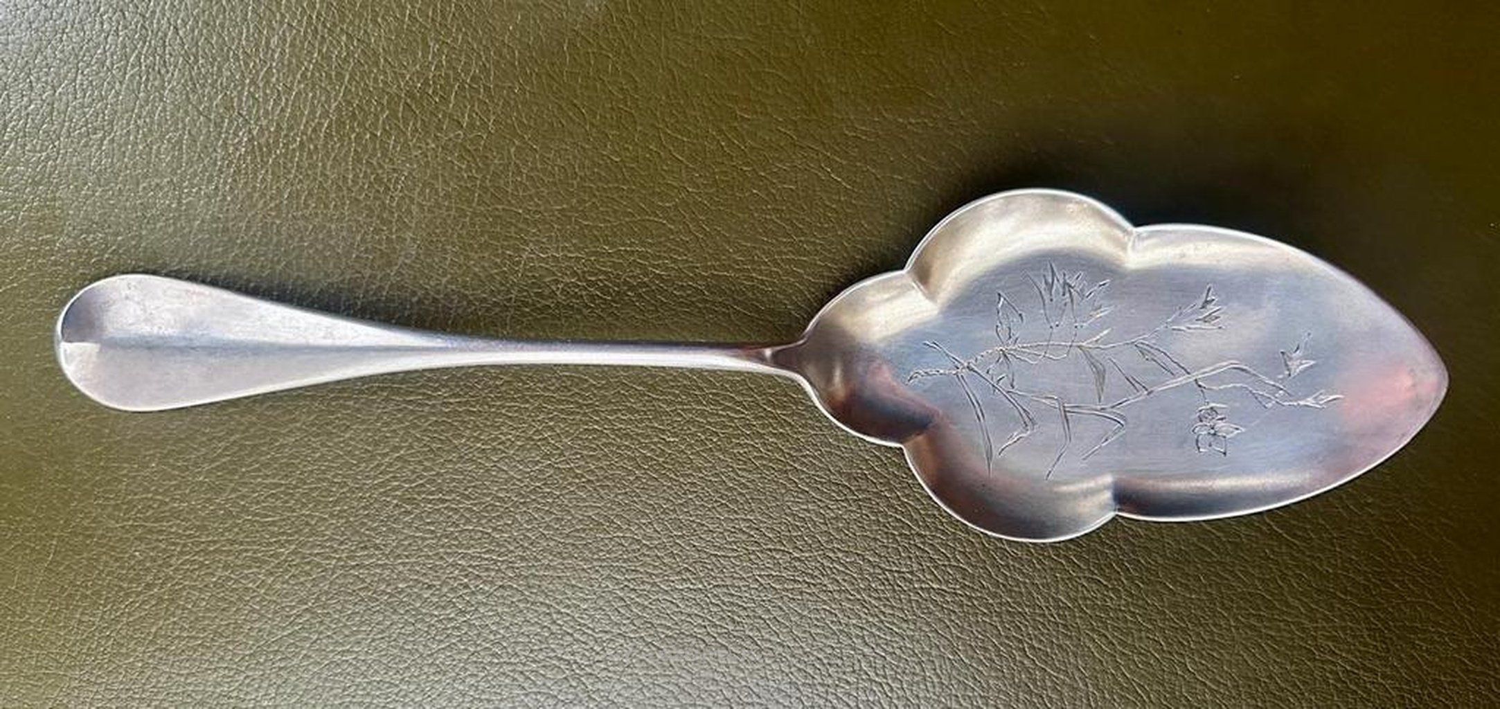 Полностью серебряная лопатка фабрики Болин. Есть в истории русского ювелирного дела имена, навечно вписанные в историю искусства. Таковым является Карл Болин. Фирма "Болин" занимает особое место в истории русского ювелирного искусства. Она была создана в конце XVIII столетия в Петербурге. С 1839 г. Карл Эдуард Болин - придворный ювелир, с 1851 г. - оценщик Кабинета, в 1862 г. ему присваивается звание потомственного почетного гражданина. Предмет уникальный, музейного достоинства! Выполнена на очень высоком художественным уровне. Предмет богато декорирован гирляндами, цветами жемчужника, остролистами. Состояние превосходное! Шедевр! Вес: 150 гр. Пробирное клеймо «Женская голова в кокошнике в профиль, направленная вправо» в овальном щитке = удостоверяет, что изделие изготовлено и апробировано в России в период с 1908г по 1917г. Литера греческого алфавита «Дельта», сопровождающая пробирное клеймо в одном контуре = устанавливает, что изделие было апробировано Московским пробирным округом, в состав которого входили Нижегородский Губернский пробирер и Тульский Губернский пробирер. Пробирное клеймо «Женская голова в кокошнике в профиль, направленная влево» = удостоверяет, что изделие изготовлено в России в период с 1899г по 1908г. Клеймо «84» = золотниковая проба в клейме удостоверяет, что изделие изготовлено из высокопробного серебра. Клеймо «BOLIN» = фирменный именник торгового дома фабрики Болин.