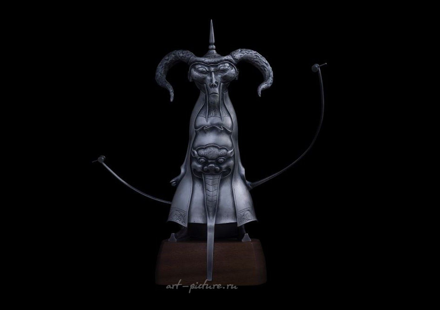 Статуэтка Даши Намдакова "Вельможа" Материал Серебро; литье, патинирование. Размер 22 х 13 х 18 см Перед нами предстает старик в богатых воинских доспехах, с боевым луком за спиной, со щитом, на котором помещена устрашающая зооморфная маска. Его головной убор украшен острым навершием и косичками, символизирующими рога животного. Поза героя, весь облик говорят об уверенности в себе, о том, что былые подвиги закалили характер и придали уверенность и достоинство этому старому знатному человеку, который держит боевой лук как привычный атрибут, пусть уже и декоративный.