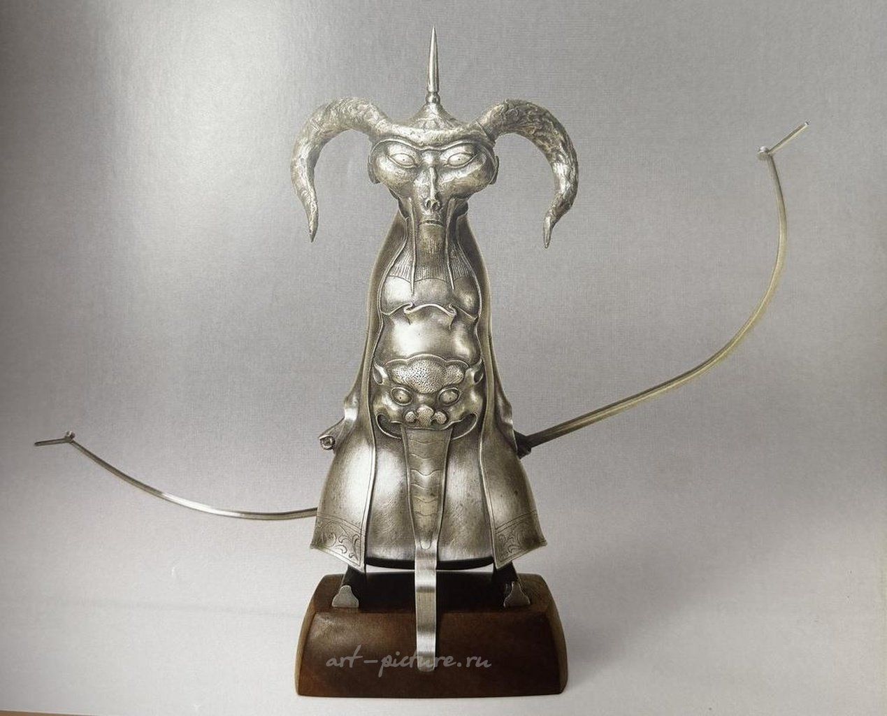 Статуэтка Даши Намдакова "Вельможа" Материал Серебро; литье, чеканка, патинирование. Размер 31 х 20 х 36 см Перед нами предстает старик в богатых воинских доспехах, с боевым луком за спиной, со щитом, на котором помещена устрашающая зооморфная маска. Его головной убор украшен острым навершием и косичками, символизирующими рога животного. Поза героя, весь облик говорят об уверенности в себе, о том, что былые подвиги закалили характер и придали уверенность и достоинство этому старому знатному человеку, который держит боевой лук как привычный атрибут, пусть уже и декоративный. Биография: Даши Намдаков (родился в 1967 году в селе Укурик Читинской области) — российский скульптор, художник и ювелир, член Союза художников России. Окончил скульптурное отделение Красноярского государственного художественного института.