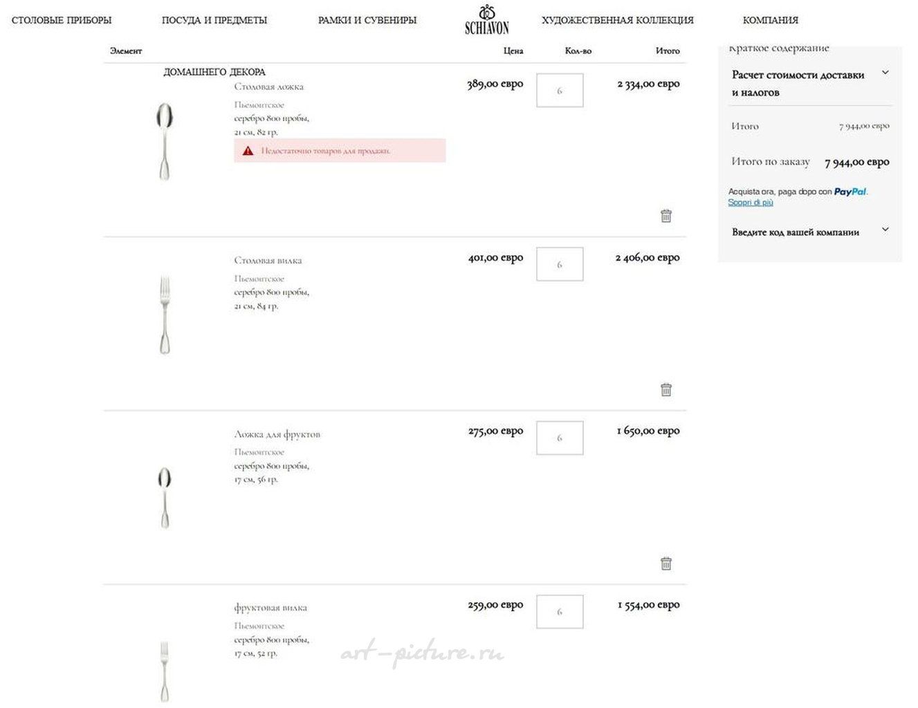 24 предмета: Ложка столовая 21 см. - 6 шт. Вилка столовая 21 см. - 6 шт. Ложка десертная 17 см. - 6 шт. Вилка десертная 17 см. - 6 шт. Пьемонтский Piemontese набор столовых приборов от Schiavon Скиавон - это традиционное украшение, которое с течением времени тщательно переосмысливалось, чтобы привнести нотку новаторства, не нарушая при этом традиционных правил эстетики. Исключительно изысканный, он предлагается в варианте из серебра 800 пробы и идеально подходит для создания превосходной сервировки стола и великолепной атмосферы. Гарантия исключительного качества. Коллекция Piemontese предлагает высочайшее мастерство и украшения и была создана для роскошных домов и столов. Каждый предмет декора аксессуаров предлагается в 800 серебре.