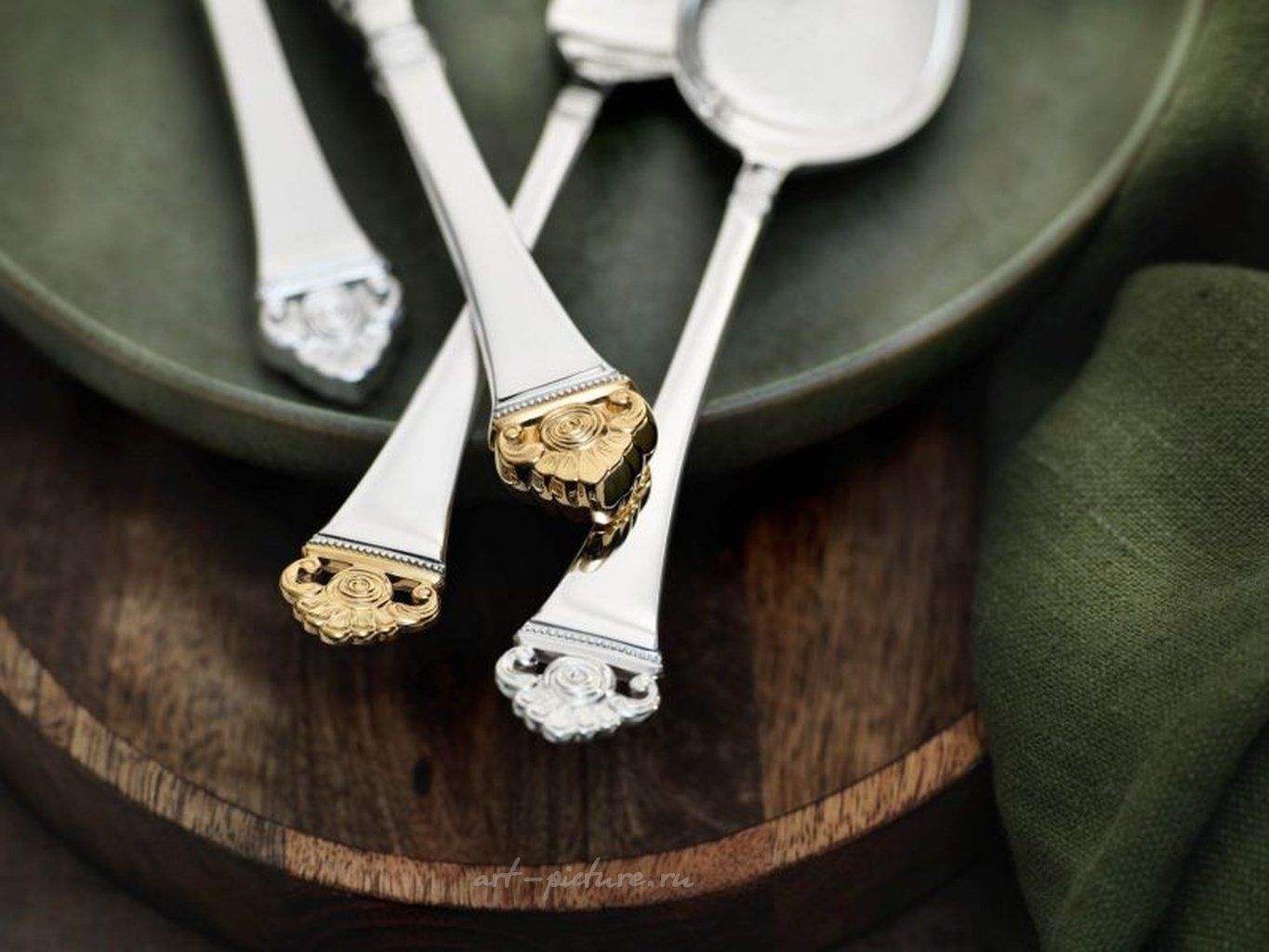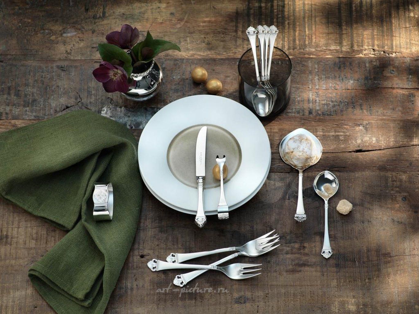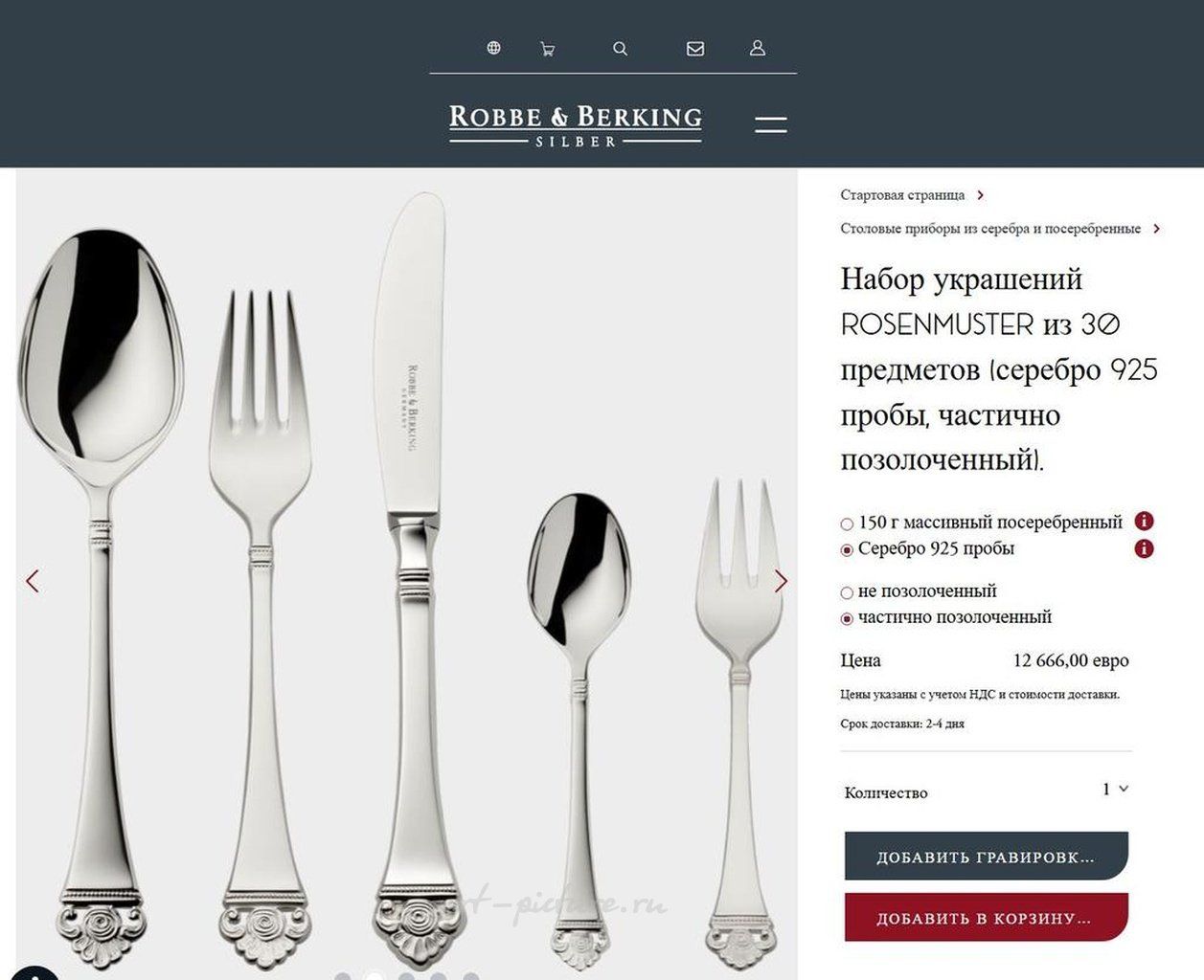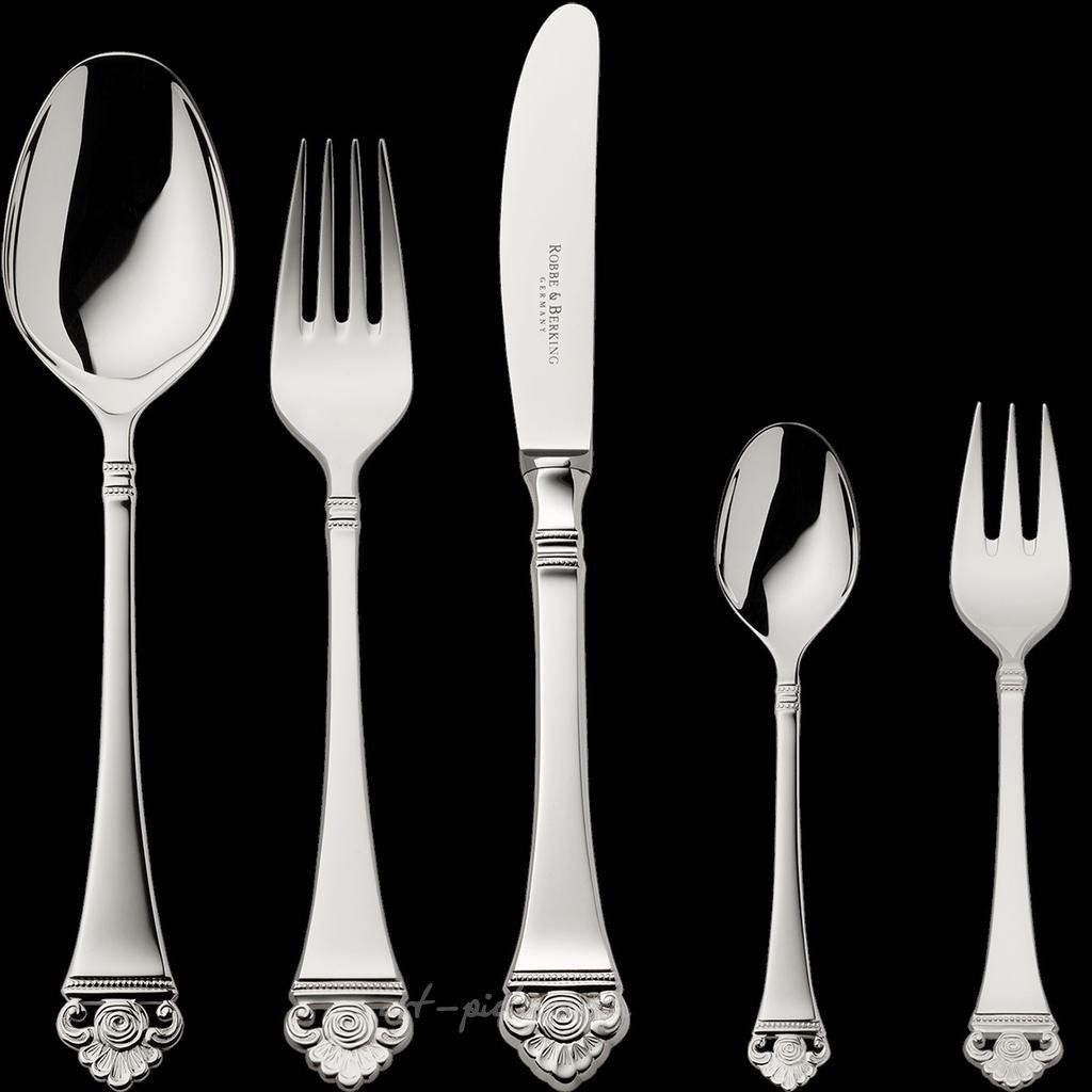 Столовый набор Rosenmuster от Robbe Berking из 30 предметов (серебро 925 пробы, частично позолоченный). Роббе & Беркинг, Розенмустер 925 стерлинговое серебро. Набор столовых приборов Rosenmuster от Robbe & Berking, состоящий из 30 предметов, — это базовый набор для сервировки стола на шесть персон. Он включает в себя столовую ложку, столовую вилку, столовый нож, кофейную ложку и вилку для торта. В набор входят: 6 столовых ложек, 6 столовых вилок, 6 столовых ножей, 6 кофейных ложек , 6 вилок для торта. Коллекция Розенмустер Rosenmuster: На каждой ручке столовых приборов Rosenmuster с любовью выполненные ажурные розы, выражающие восхитительное очарование этого самого красивого и элегантного из всех цветов. Особой популярностью пользуется позолоченная версия этих столовых приборов, где роза щедро покрыта золотом вручную на мануфактуре Robbe & Berking. Ручная работа встречается с ремеслом Компания Robbe & Berking, производитель изделий из серебра, была основана в 1874 году и до сих пор остается семейным предприятием. Совершенство и качество нашей продукции не имеют себе равных в мире, массовое промышленное производство здесь не рассматривается. Формы и декоративные детали создаются руками наших мастеров-ювелиров. Лучшие отели мира, рестораны, отмеченные звездами Мишлен, и многочисленные королевские семьи полагаются на высокое качество и уникальный дизайн изделий из серебра Robbe & Berking.