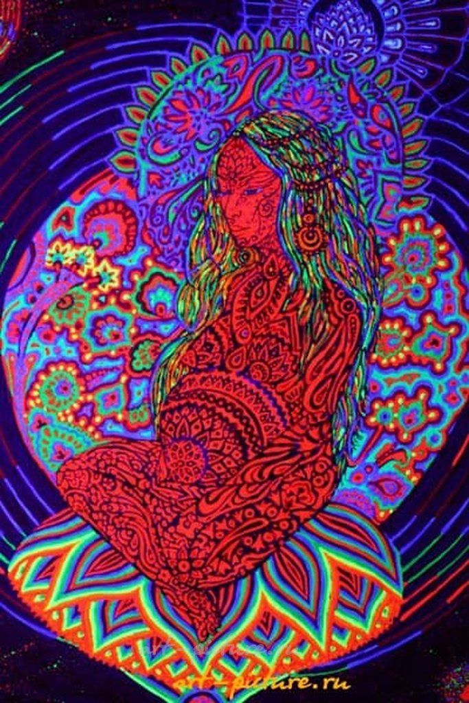 Эта картина словно открывает дверь в другой мир, где цвет и форма сливаются в одно целое. Яркие узоры и флуоресцентные оттенки создают ощущение глубины и движения, в то время как фигура в позе лотоса излучает гармонию и спокойствие. Безусловно, это произведение искусства заставляет задуматься о связи человека и природы в их самых ярких проявлениях.