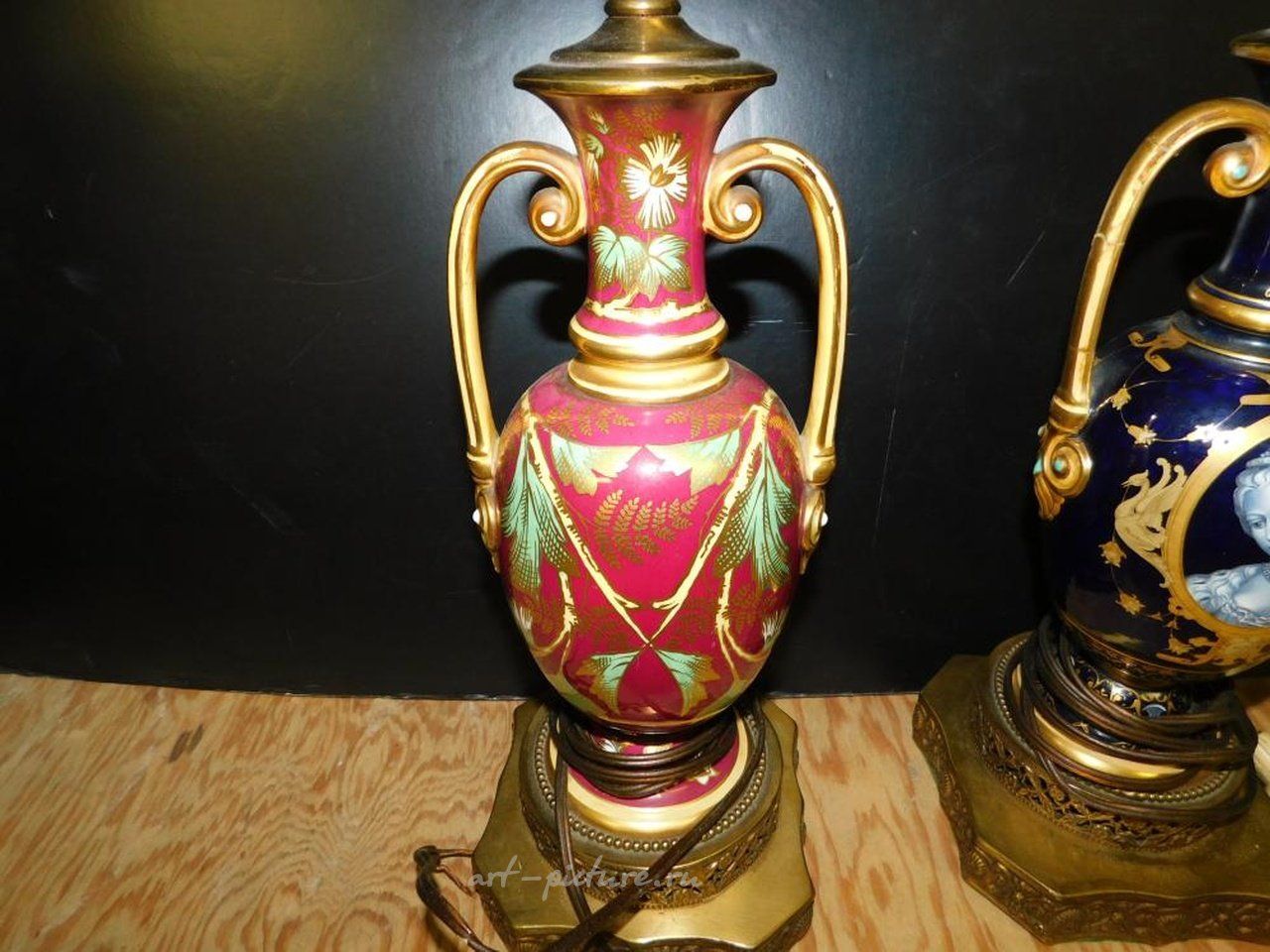 Пара ручных ваз 19 века, преобразованных в лампы. Синяя урна из кобальтового стекла - ручки отремонтированы. В стиле Лиможа или королевской Вены. Высота - 23 дюйма.