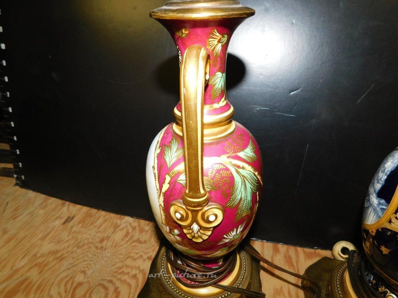 Пара ручных ваз 19 века, преобразованных в лампы. Синяя урна из кобальтового стекла - ручки отремонтированы. В стиле Лиможа или королевской Вены. Высота - 23 дюйма.