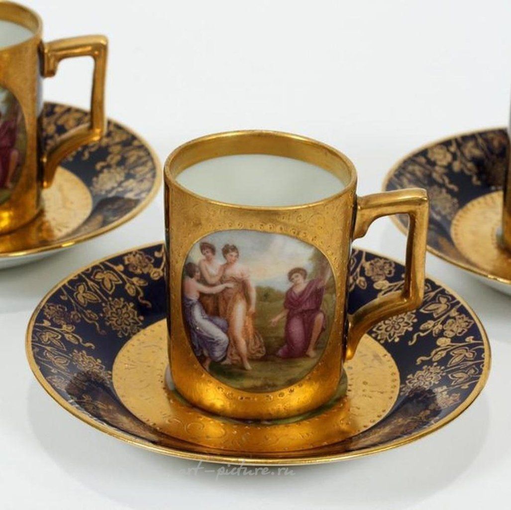 Фарфоровые чашки для деми-кофе, блюдца 9 комплектов, высота 4,1 дюйма: аллегорические фигуры в резерве. Обрамление из золота. Wenzl Hubber & Co. Мариенбад и другие: Шлагнвальд, Чехословакия. Дю Пакьег начал производство венского фарфора в 1718 году, сделав Вену вторым по старости производителем хард-пастового фарфора в Европе. В 1744 году, столкнувшись с финансовыми трудностями, дю Пакьег продал свою компанию императрице Марии Терезии, члену австрийской королевской семьи, которая основала Королевскую фарфоровую мануфактуру или Королевскую Вену. Более ста лет Королевская Вена производила прекрасные рококо и неоклассические изделия, часто изображая сцены жанра знаменитых современных художников. Однако Самуэль Штёцель из Мейссена быстро обманул своего работодателя и продал тщательно охраняемую тайну компании - использование каолина, или фарфоровой глины, для Клаудиуса Иннокентия дю Пакьега в Вене.